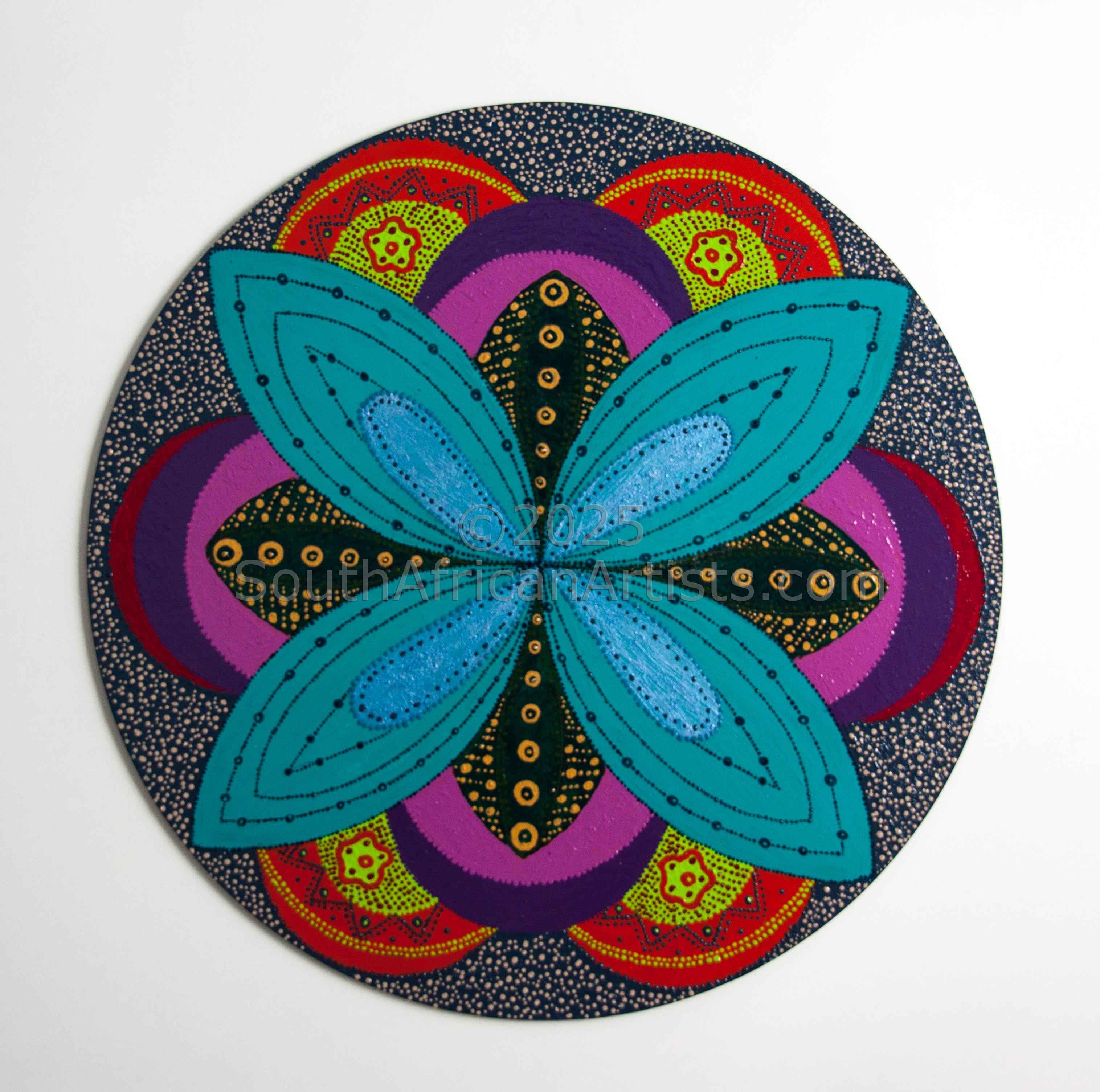 Laurinda craft her mandalas, using colour as background medium, drawing symbols and patterns in pointillism. She also makes use of paper mache to further enhance the designs.
