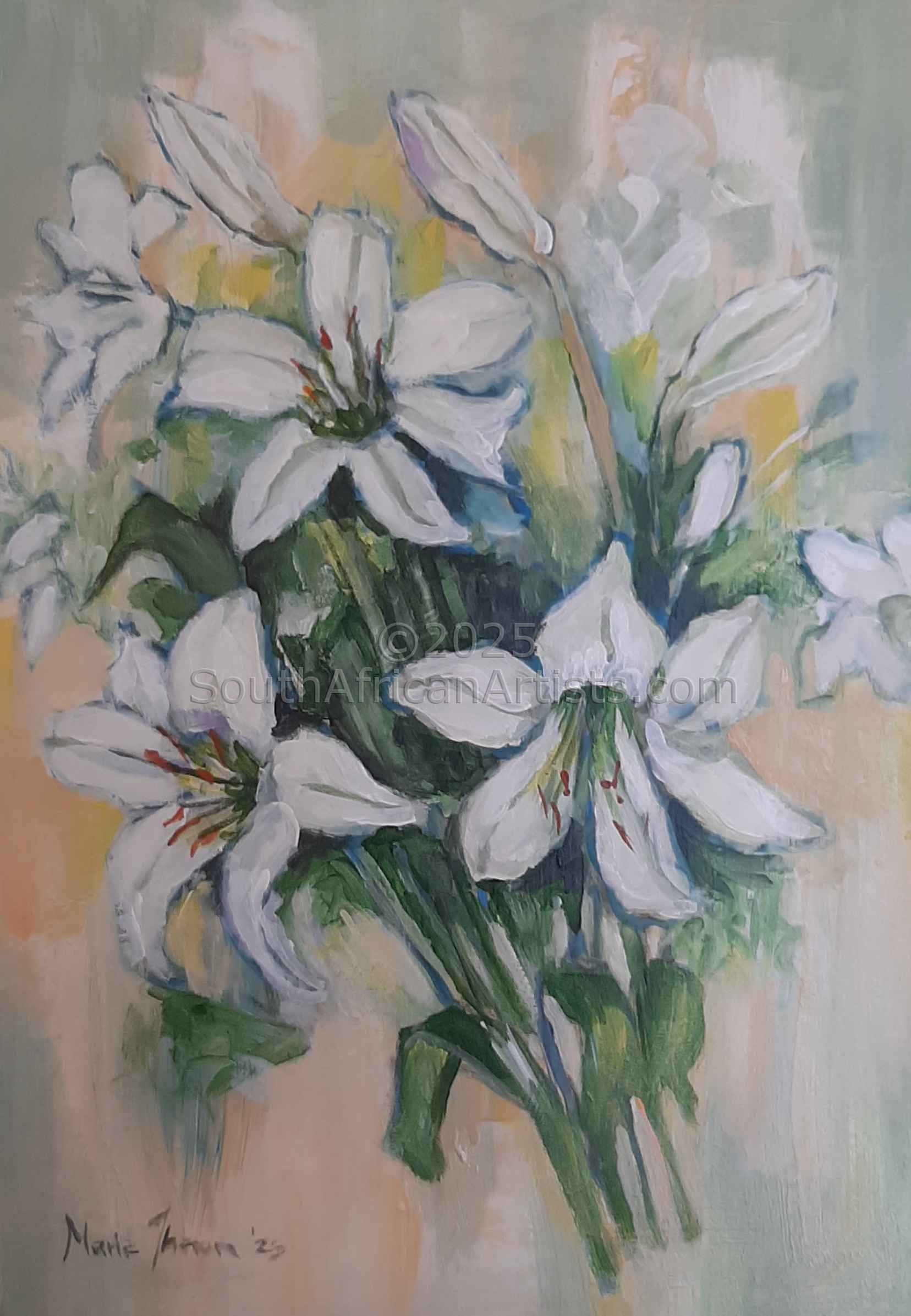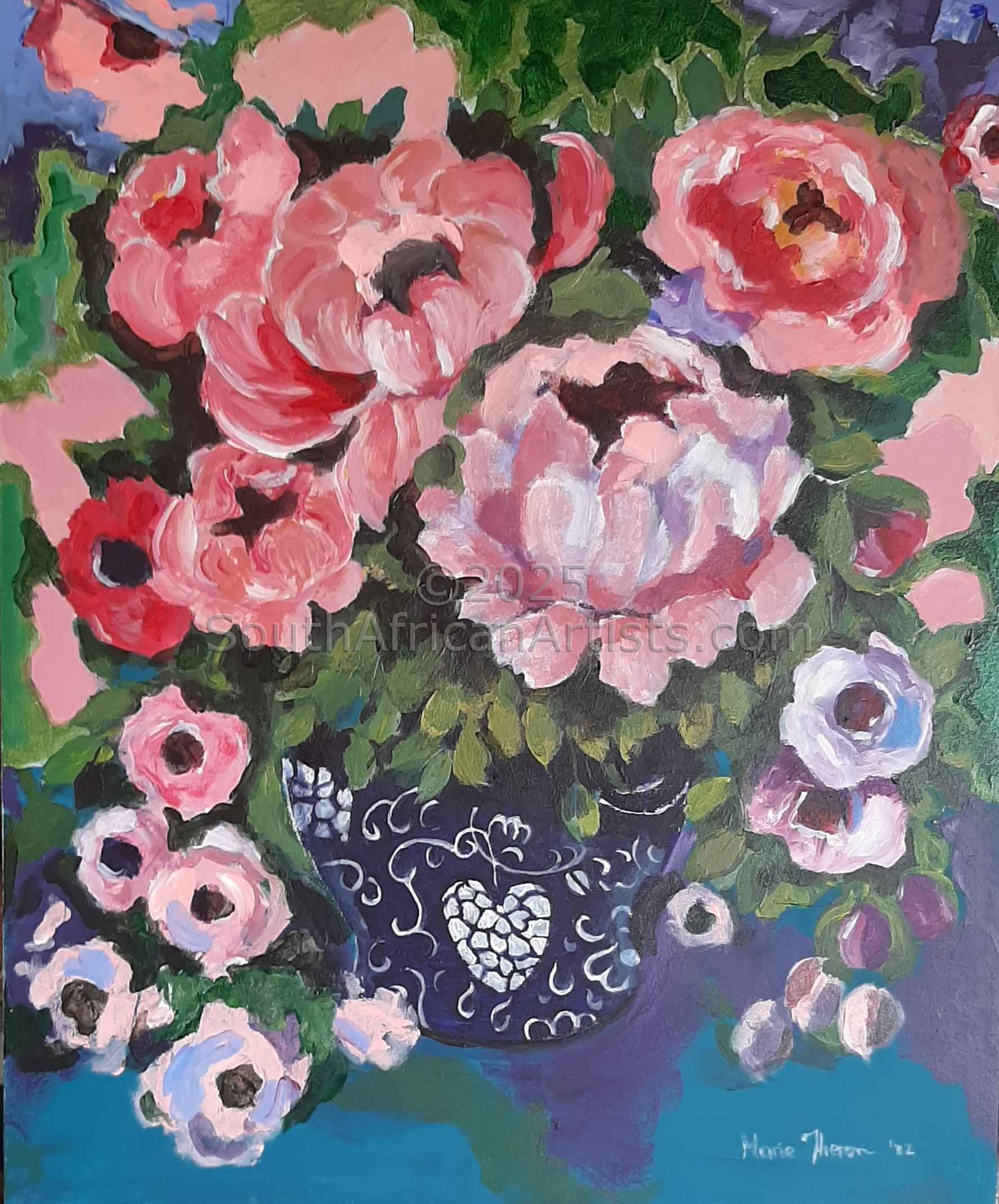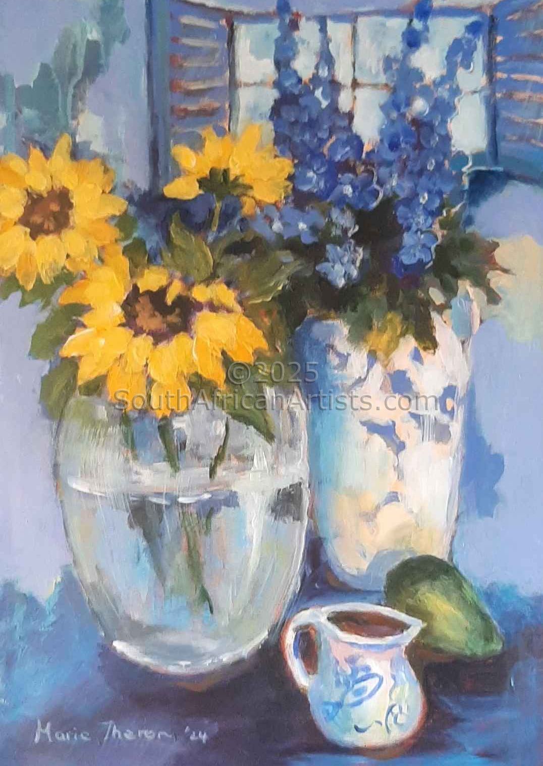 South African Marie Theron (b. 1944) was trained as an Art Teacher. She has held solo exhibitions both locally and overseas and has participated in exclusive group exhibitions. Investors in her oil and acrylic works range from foreign embassies, corporate offices, guesthouses, libraries, hospitals and international private collectors. Her work has sold in Australia, Britain, Canada, Croatia, Ireland, Hungary, the Netherlands, Germany, Austria and the USA (more than 30 paintings in America) She was commissioned by the Ass of Arts Pretoria, the Croatian Embassy and Academia Cravatica in Zagreb to submit a painting "Sister Power" for "The Challenge of the Tie", a world-touring permanent exhibition which toured Pretoria, Johannesburg, Brussels, Prague and Brazilia in 2005 and further around the globe in 2006.