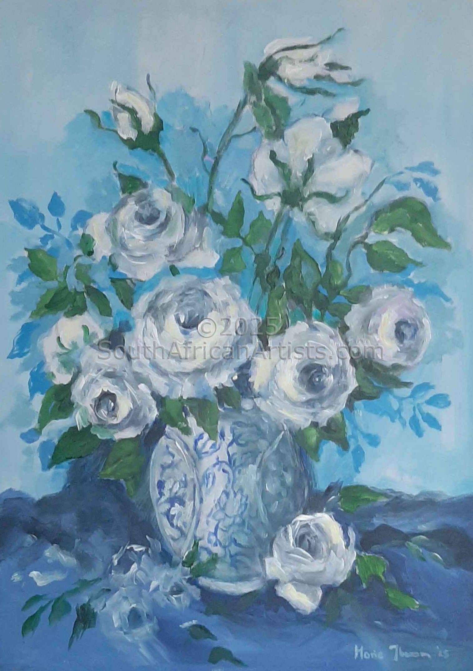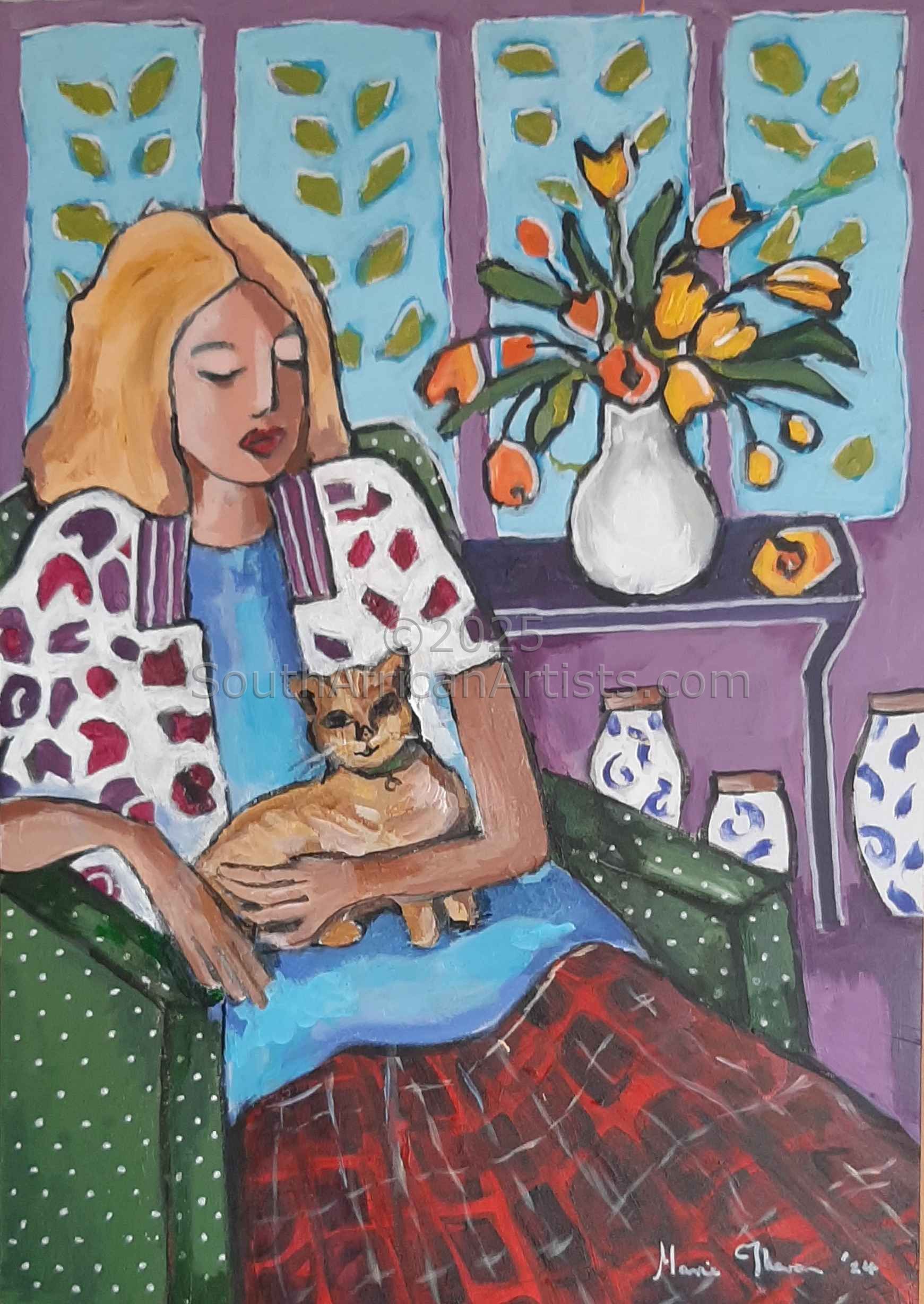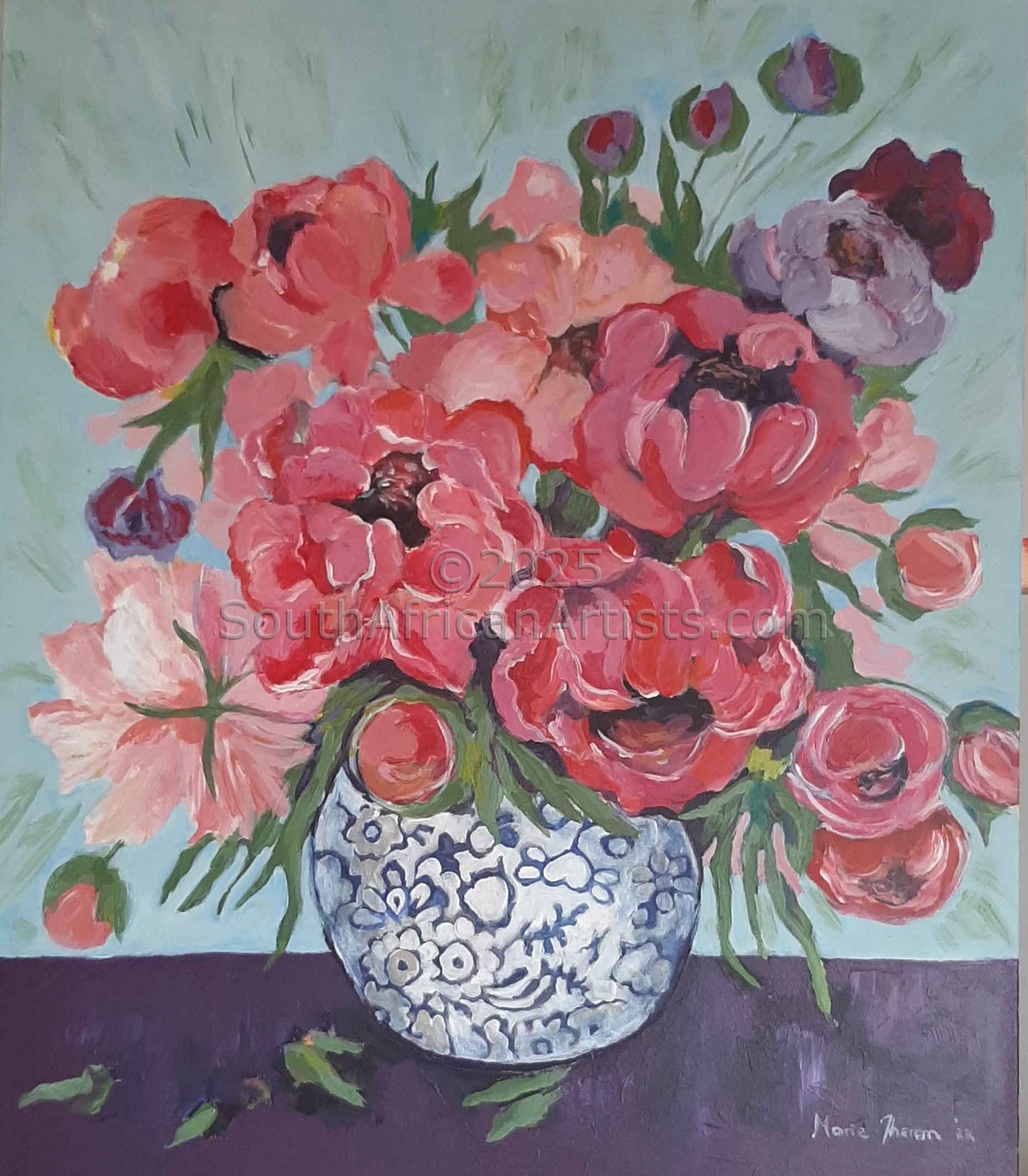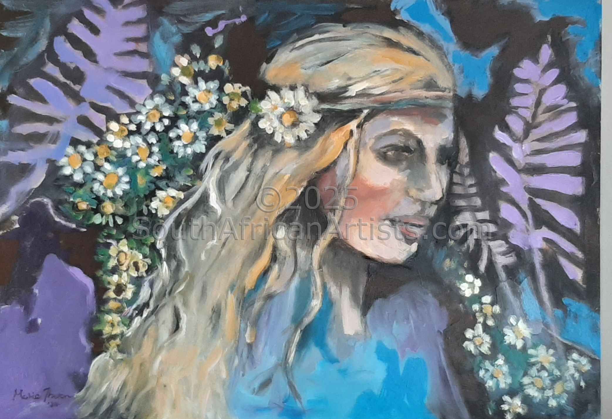 South African Marie Theron (b. 1944) was trained as an Art Teacher. She has held solo exhibitions both locally and overseas and has participated in exclusive group exhibitions. Investors in her oil and acrylic works range from foreign embassies, corporate offices, guesthouses, libraries, hospitals and international private collectors. Her work has sold in Australia, Britain, Canada, Croatia, Ireland, Hungary, the Netherlands, Germany, Austria and the USA (more than 30 paintings in America) She was commissioned by the Ass of Arts Pretoria, the Croatian Embassy and Academia Cravatica in Zagreb to submit a painting "Sister Power" for "The Challenge of the Tie", a world-touring permanent exhibition which toured Pretoria, Johannesburg, Brussels, Prague and Brazilia in 2005 and further around the globe in 2006.