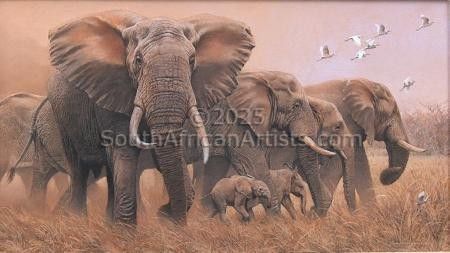 Elephant Herd with Cattle Egrets