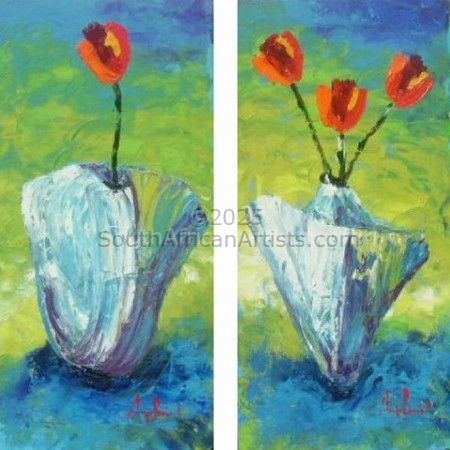 Blue Vases and Red Tulips