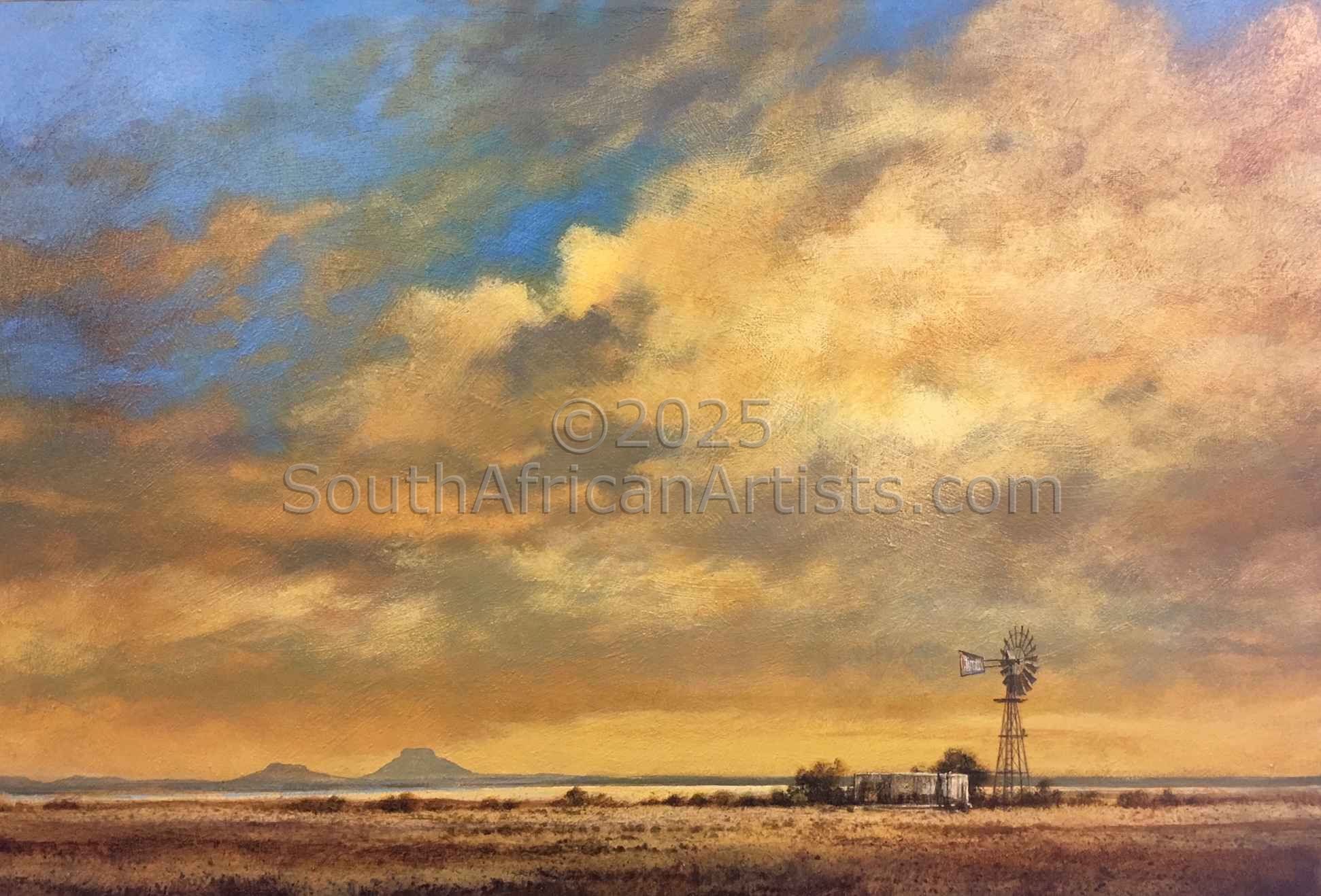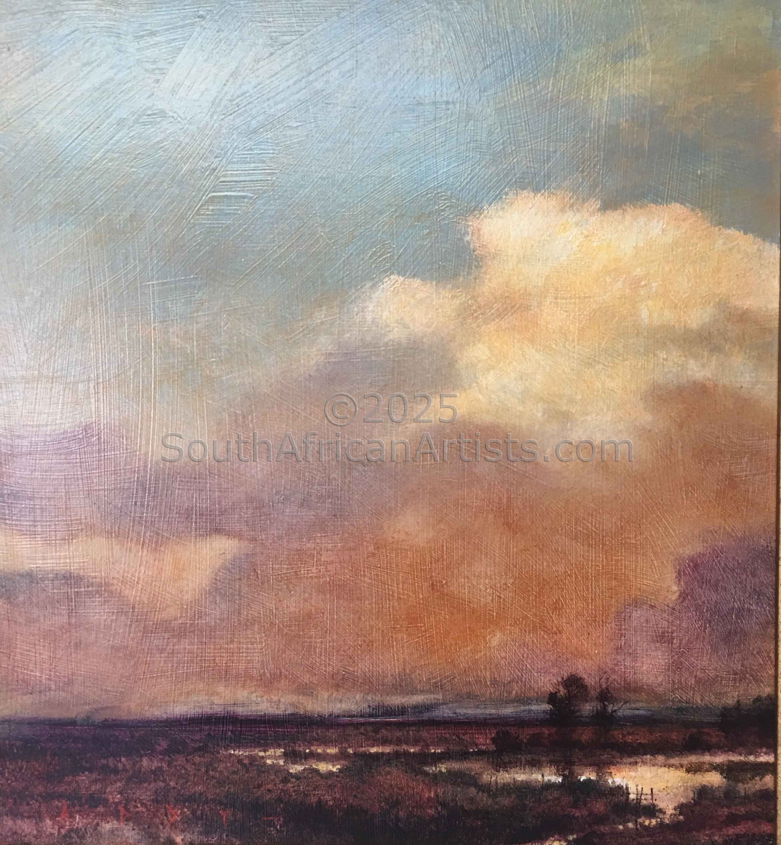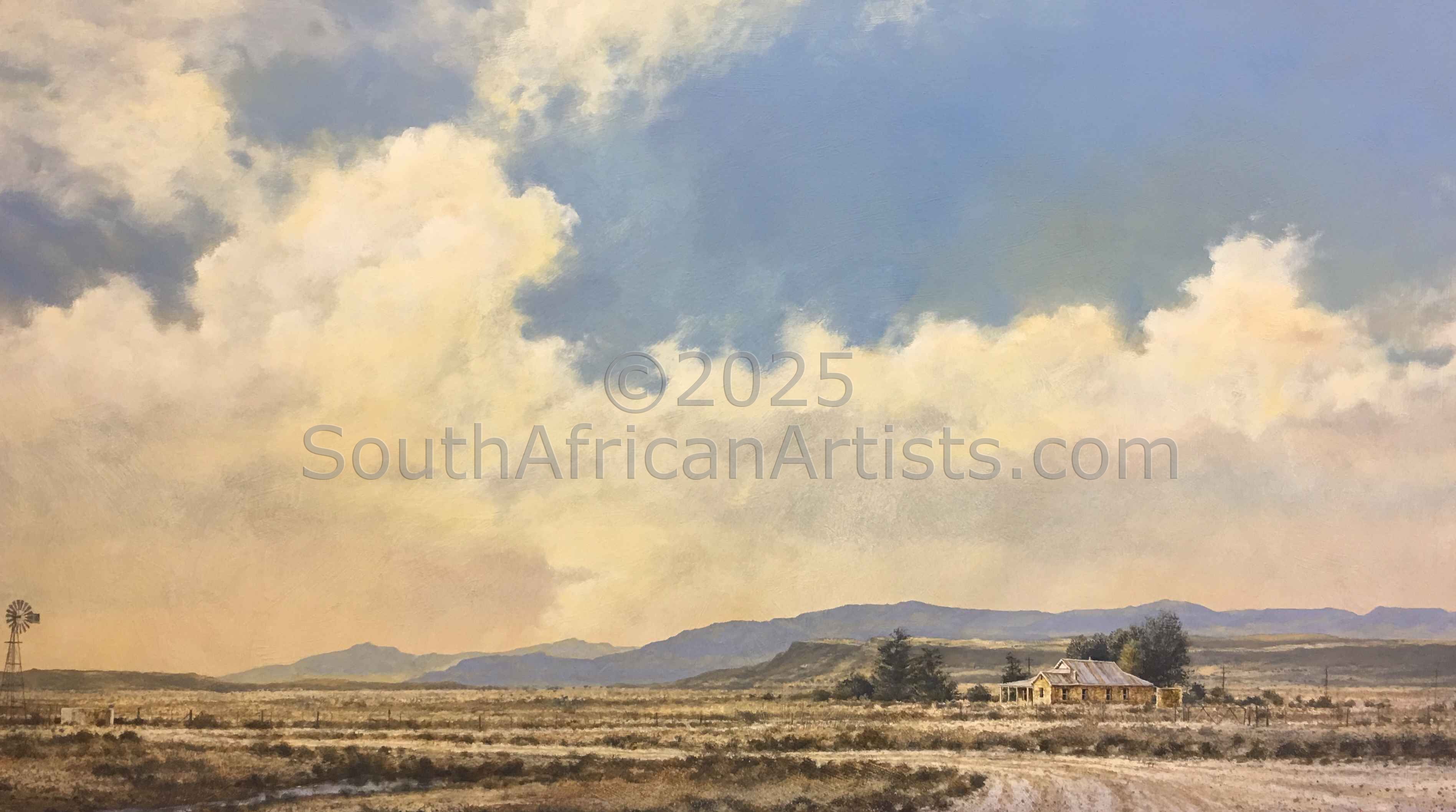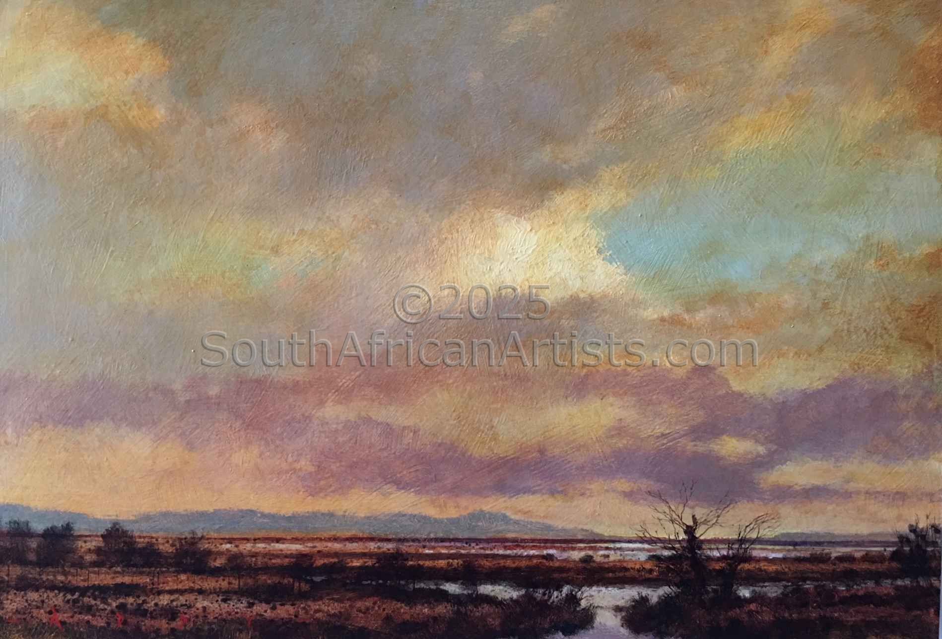 Rendered with a passion and technical facility reminiscent of the Old Masters, Simon's landscapes evoke the spirit of the Eastern Highlands' bleached winter grasses, veldfires, and old stone houses under brooding skies. His travels in search of soulful scenery produce moody studies of wintry Natal Midlands river-courses and wetlands, and deserted Northern Cape farmhouses.