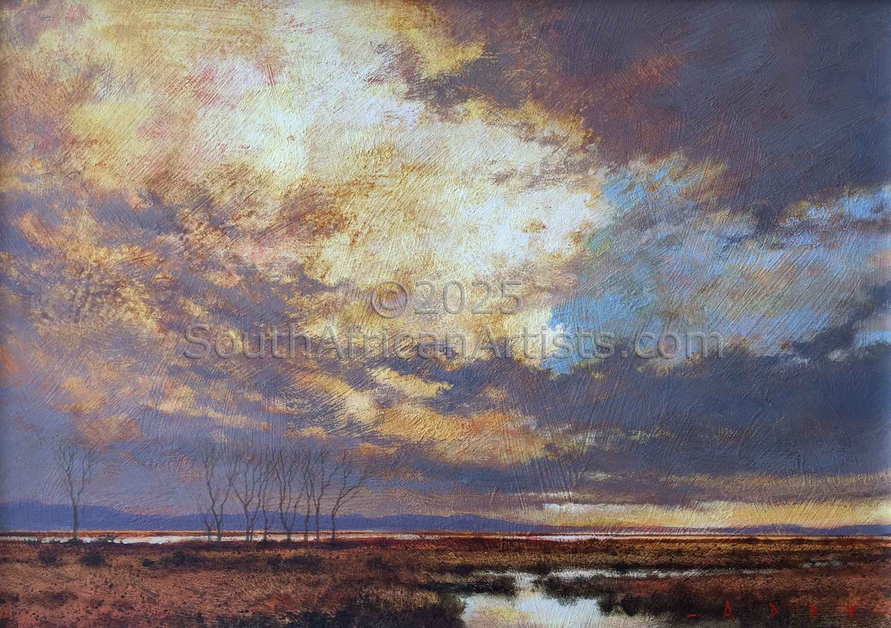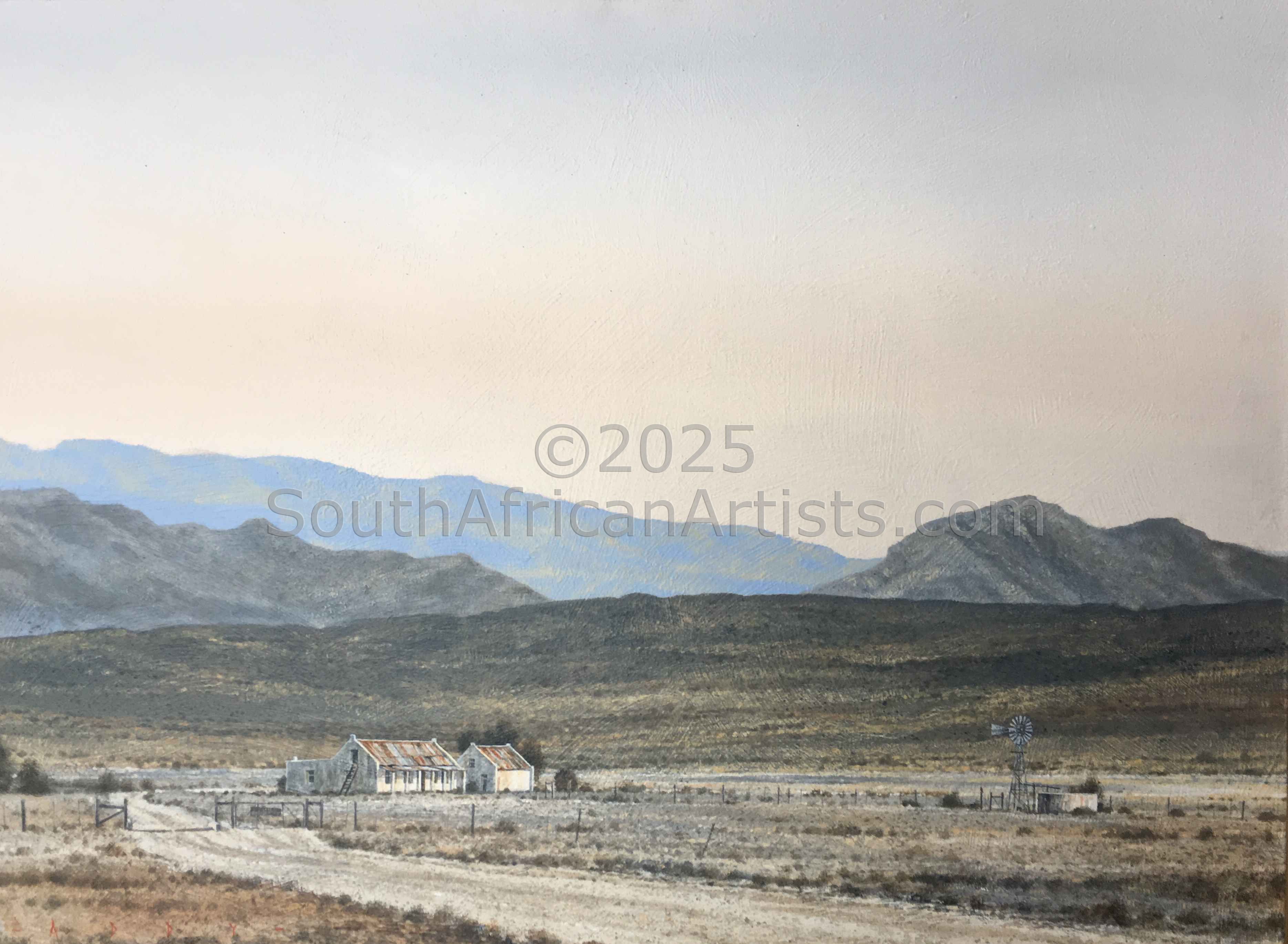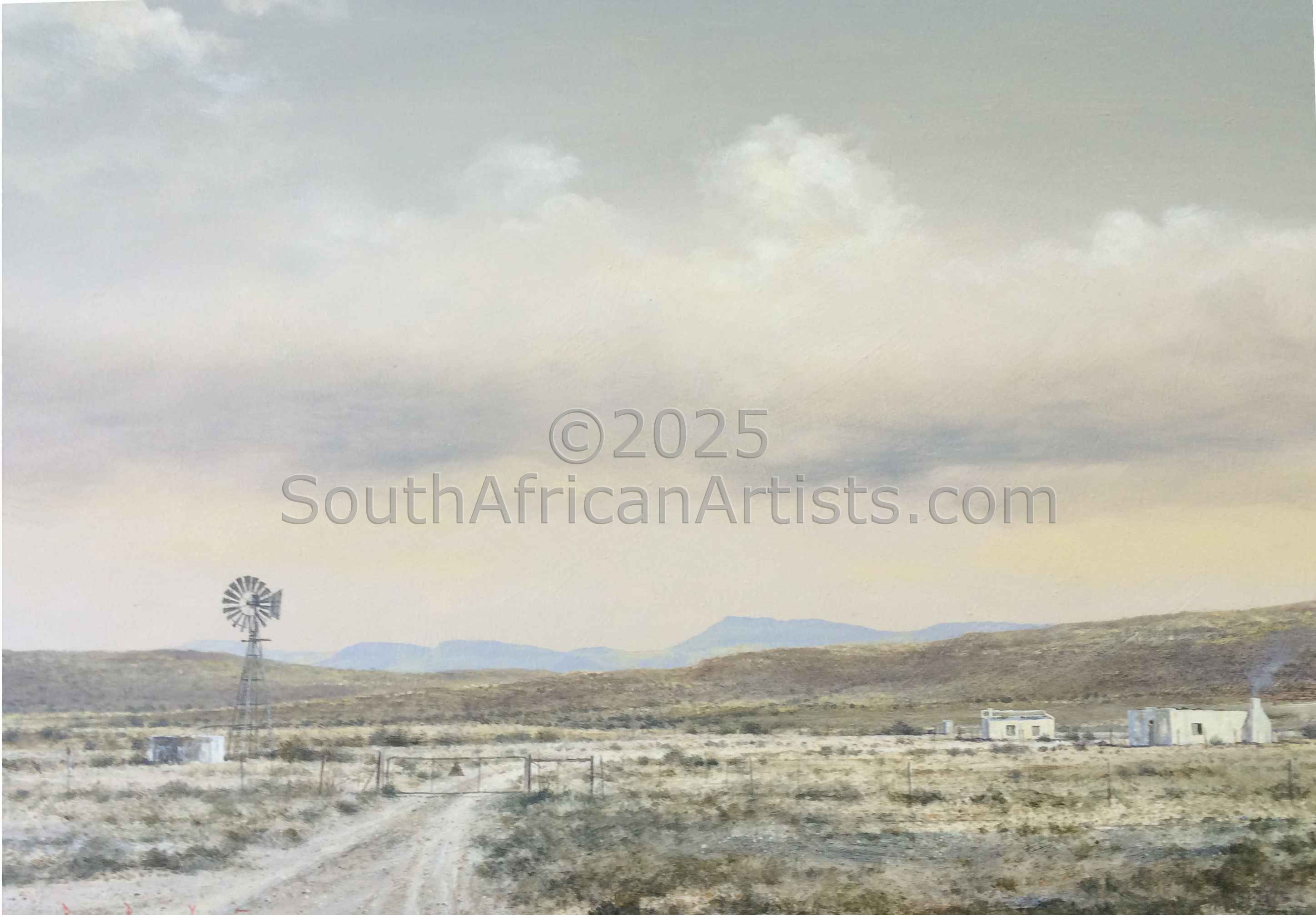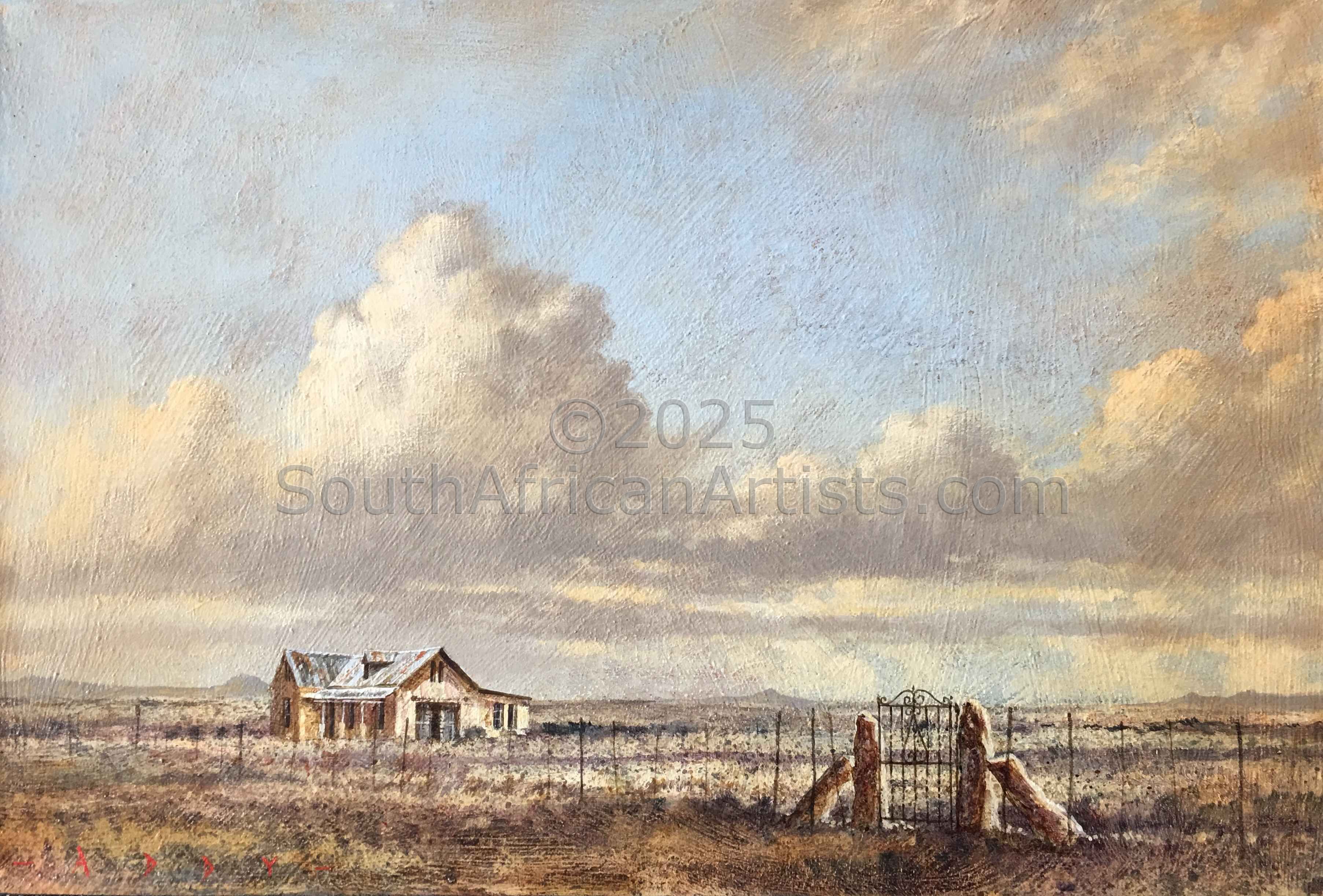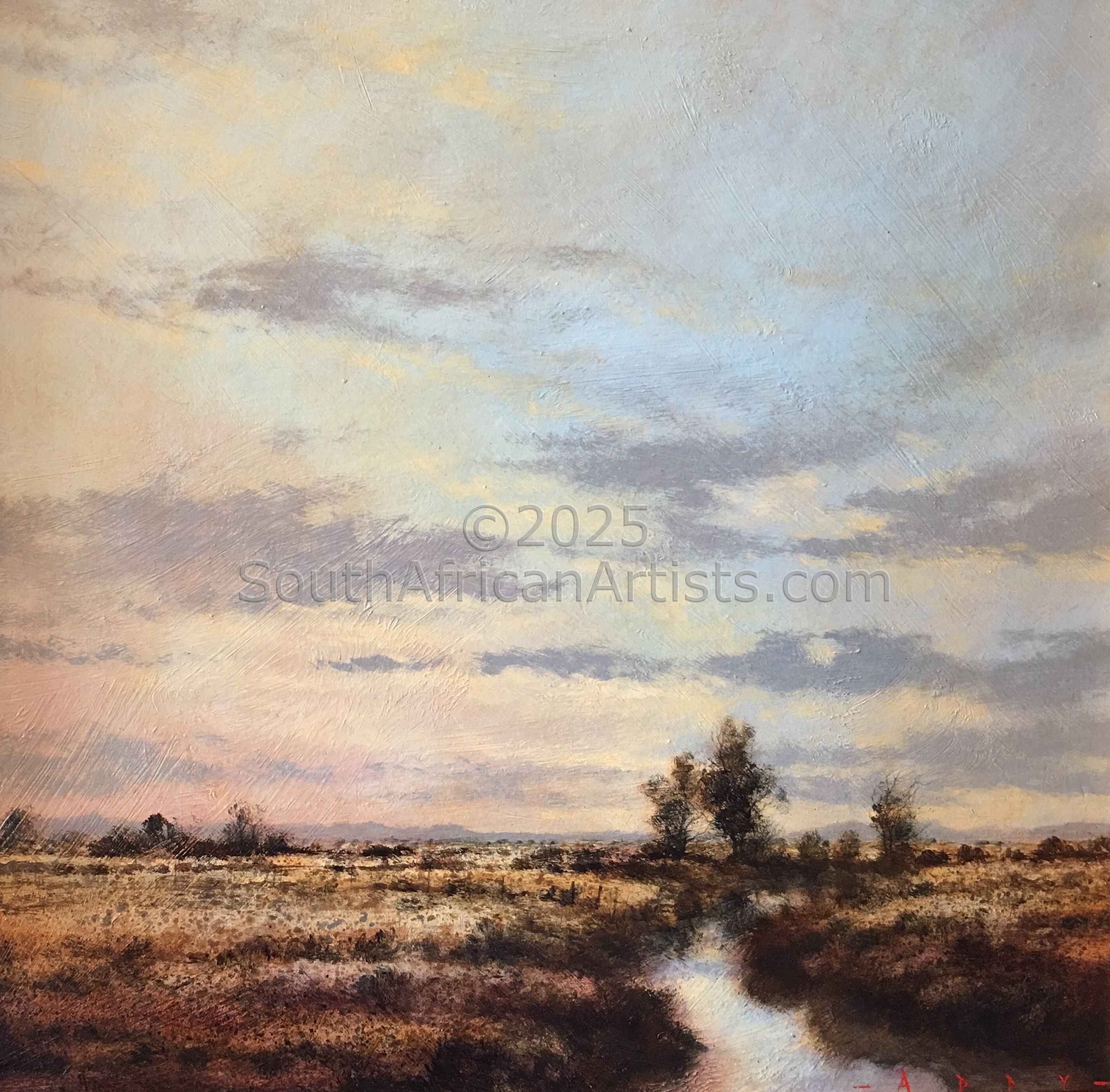 Rendered with a passion and technical facility reminiscent of the Old Masters, Simon's landscapes evoke the spirit of the Eastern Highlands' bleached winter grasses, veldfires, and old stone houses under brooding skies. His travels in search of soulful scenery produce moody studies of wintry Natal Midlands river-courses and wetlands, and deserted Northern Cape farmhouses.