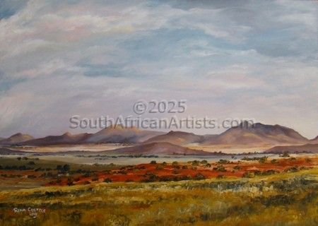 My imagery is inspired by the stark vastness of the southern Free State.Every aspect of my live is influenced by the land. I draw my inspirationfrom observing nature, always on the look for magical moments.My work has been an ongoing exploration of what it feels like to be in that space, surrounded by all that air and light, feeling the tug of the horizon 360 degrees, the sense of limitlessness and blissful isolation. It always begins with an awe-filled moment-an area with an intense contrast of light, dramatic shadows or shapes-something that will sustain my interest through the painting process. The horizon and clouds are a magnet. I'm always drawn to the distant, blue horizon and the succession of hills that create a tremendous sense of vastness. The creative process is about discovery. If you're not discovering something in each attempt, the work is probably lifeless.Rina started her career in Gauteng where she studied art at the Technicon, Pretoria. Afterwards she achieved a BA(FA) at Unisa. Later she continued with art tuition under Otto Clar and Carlo Sdoya. In 1976 Rina held a one man exhibition on invitation from the Transvaal National Museum, where she sold out. Between 1971 and 1980 she was artist-in-chief at Perskor Publishers, Jhb. Brill Bros, Jhb, manager of the art department of Consul Glass & Plastics, Wadeville and production manager at Educum Publishers, Jhb. Rina illustrated 67 children's books and received the National ATKVeertjie for the best children's book illustrations in 2000. Rina also did the graphics for several children's programs on SABC TV. Pumpkin Patch, Kideo and others. In 2001 she painted 25 contemporary paintings from the Bible Books Job and Lamentations. These paintings are now on a permanent exhibit in the Job Room, Jobhuis in Philippolis. Since 2001 Rina has been a full time artist. Price Range US$ 71-1,873 People who chose Rina's work also chose work by: Find other: