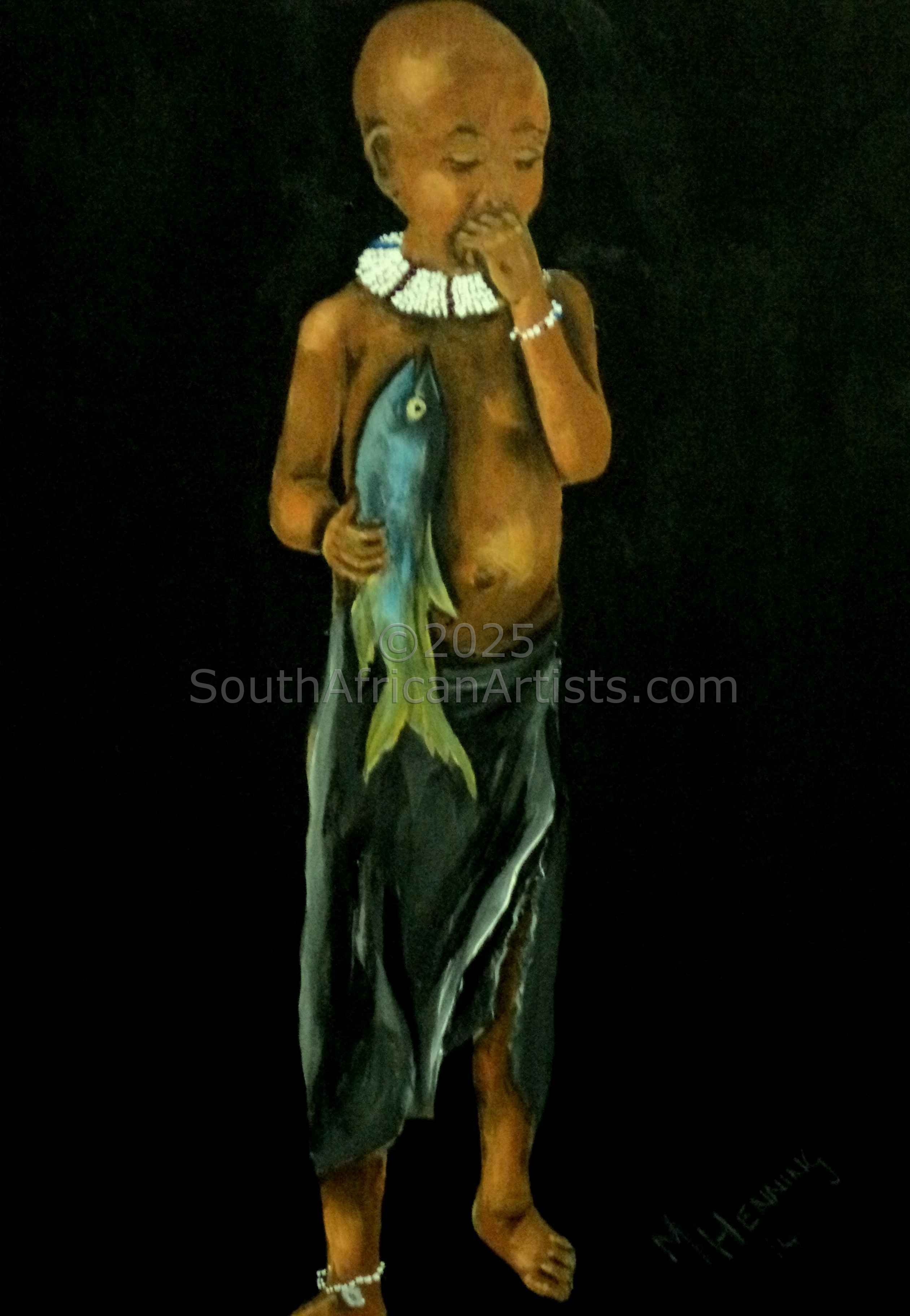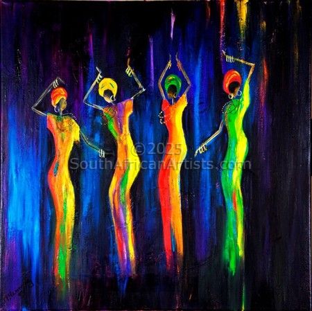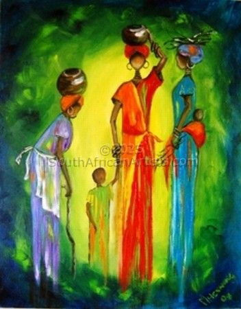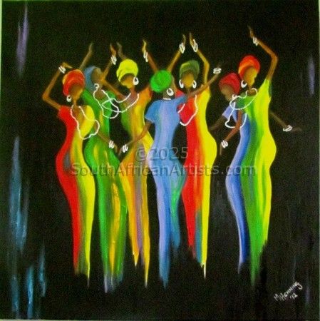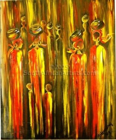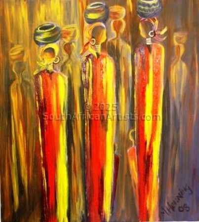 Marietjie Henning self taught artist as well as Art Curator of Mbombela Art Gallery, has never had formal training, she has always felt a passion for art and did her first oil painting at the age of 50. The themes of her paintings have changed with the emotional ups and downs of her personal life, but sisterhood and maternity is a recurring vision that she feels an affinity to, being a grandmother to 10 children and an artistic haven for the community children. She used to start out with dark and sombre colours but recently her work represents rich and warm colours. One of the themes she dotes on is a family of women, complete with Gogo (grandmother and her daughters), Sisters and children and Sisterhood. All tall, mystery figures in a misty, dawn background. I feel a coherence with them, a part of their Sisterhood. The shadow figures who carry their children and belongings to the streets to make a living out of selling goods that commuters would buy. I realized what strength we women have in common, to be brave and to face the world out there in spite of our circumstances at home. To confront our sorrows and be positive and brave to be able to give our best to our children and the world around us, she says. Marietjies work have been exhibited at various Art Festivals and art exhibitions all around the country as well as the 2010 Art Exhibition during the 2010 World Soccer Games, and her work have been sold as far as Sweden, Italy, Mocambique Germany, Mauritius, United Kingdom, America, Seycelles and many other countries. As I have never had the opportunity to study art or had any form of training in the art of painting, I thank the Lord for giving me a talent that makes me both humble and human.