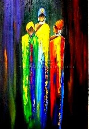 The themes of her paintings have changed with the emotional ups and downs of her personal life, but sisterhood and maternity is a recurring vision that she feels an affinity to, being a grandmother to 10 children and an artistic haven for the community children. She used to start out with dark and sombre colours but recently her work represents rich and warm colours.