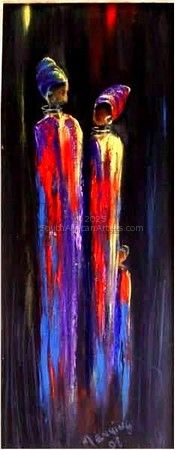 One of the themes she dotes on is a family of women, complete with Gogo (grandmother and her daughters), Sisters and children and Sisterhood. All tall, mystery figures in a misty, dawn background.