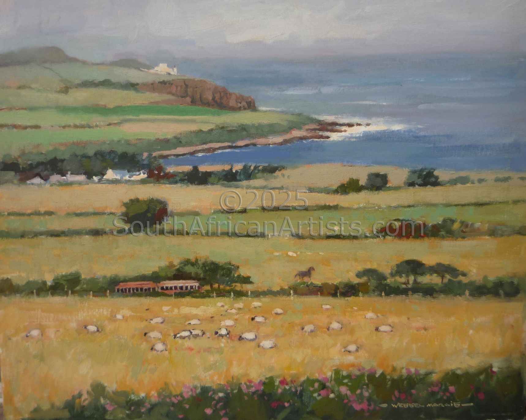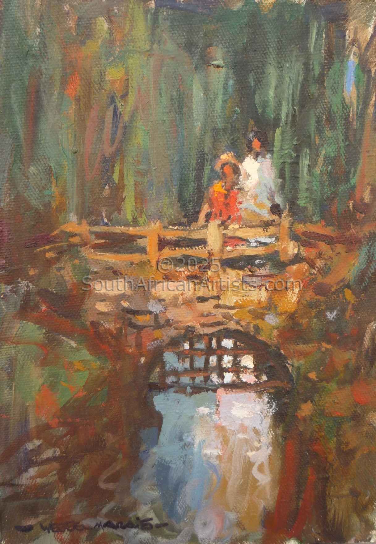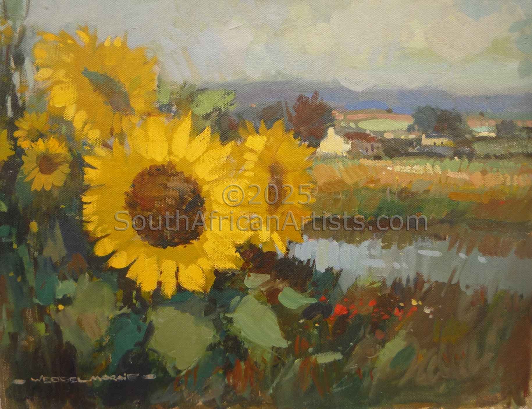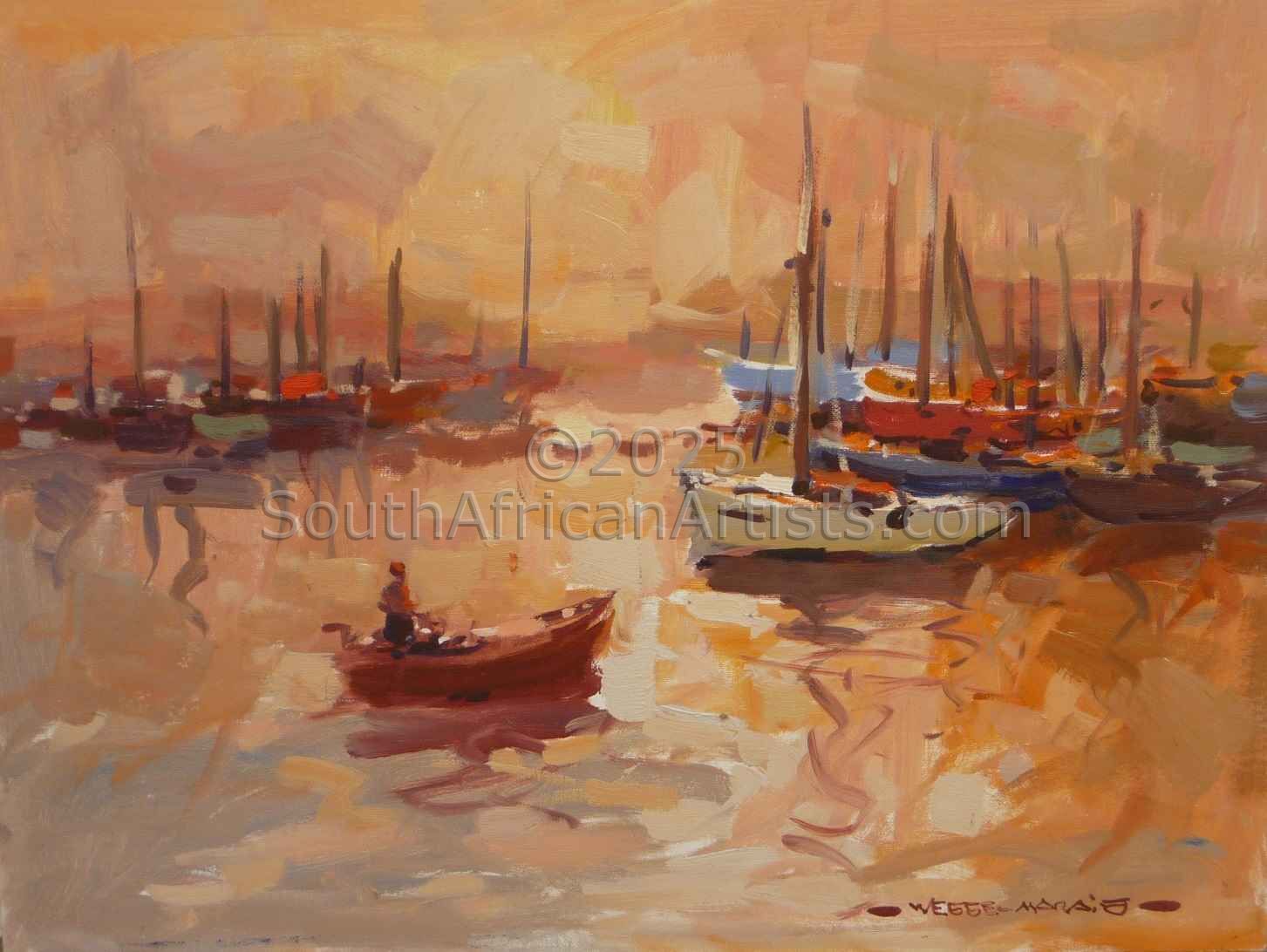 Wessel Marais (1935 - 2009), the son of a postmaster, was born in Magaliesberg. Before his school-going age, his father was transferred to Welverdient, near Potchefstroom, where Wessel grew up on a plot amongst the white, pink and crimson cosmos. A friend, Simon, who was older than Wessel, introduced him to drawing with sticks in the sand. They mostly drew trains and use to draw them upside down. Wessel's father was also a kind of artist, a poet and actor, from whom he seemed to have inherited his talent to create. At the time art was considered not economically viable to pursue as a career. His ambition to become a pilot was not practical at the time and Wessel decided to follow his father's footsteps and joined the post-office. This resulted in him moving to Swaziland where he worked in the post office and lived there for two years. After he returned to Pretoria, the opportunity arose to study commercial art after hours. Wessel left the post office and joined the OK Bazaars in town as head of their commercial department where he was responsible for hand painted billboards, window dressing and advertising. At this time Wessel was still taking art lessons after hours learning how to do paintings in pastel and oil, and drew inspiration from landscapes and the masters of French impressionism. During this time, Wessel sold his first paintings which were done in oil and watercolours. When Guiseppe Cataruzza, an Italian painter who had his own gallery in Pretoria, came across some of Wessel's work, he invited Wessel to visit him at his gallery. He gave Wessel valuable advice on how to improve his technique and offered to exhibit his art. Encouraged by his instant success, he felt that he was ready to face the world as an artist. It was a big decision for a family man, with two children, to exchange the sheltered job for the life of a painter. His wife, Christine, gave him the support he needed to take this important step in his life. Wessel held his first solo exhibition in Potchefstroom. Exhibitions in Johannesburg, Cape Town and at the Schweickerdt Gallery in Pretoria followed. His landscapes, city scenes, flower studies, still life's, Hout By scenes, Cape coons and children playing, have become sought after collectors' items. Wessel Marais' work has been extensively collected by private individuals and corporations alike, both in South Africa and internationally. Although much of Wessel's subject matter is South African, his style and manner of painting have a global appeal. Wessel believed that a skilled artist must be able to interpret any subject matter successfully on canvas. His personal preferences were to portray everyday scenes with an instinctive playful unrestricted and poetic intuition. His ability to portray in vibrant colours is a gift which is highly appreciated by many of his admirers. Wessel was quoted to say that, "When I am at work, I am totally absorbed with the intangible elements of the subject matter I try to portray. It is not so much the subject that matters, but the mystic energy floating form it that I try to capture in my oils. Sometimes, I think, I come close to succeeding in the capture of the indefinable element some people describe as art. I am however still learning, drawing most of my inspiration while flying my plane, a glider which has made it possible to realize my ambition of becoming a pilot". After a long and fruitful life, Wessel Marais sadly passed away in April 2009.