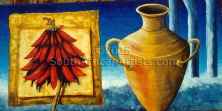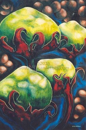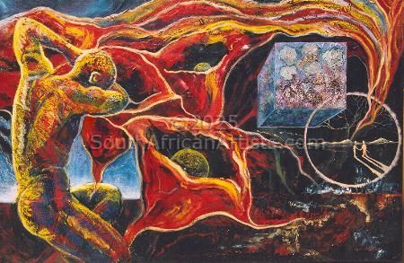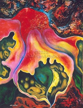 Moller grew up in 'what was then a small sea-side town'. He hated school and was uncomfortable with family-life so he mostly headed off on his own. When he wasn't bounding after butterflies or accosting arachnids, he spent his time in the many secret spaces between the rocks by the sea, where he snorkeled and always found himself fascinated and utterly in awe of the unexpected and exotic life-forms that existed beneath the surface of the ocean. 'Had it not been that the Art Bug bit me early in my life, I would have been a Bug Scientist - no doubt!' he says. 'It is my early fascination with Natural History in its entirety that still drives my art today. In my art the expression is more condensed, though, in that it deals with a search for - or maybe an understanding of - the essence of the life force. It's about what makes us aware, feel, twitch and respond... about what makes us happy and sad; all in a very human, inexplicable way. On the one hand it is the love of life, the mystery, the magic, the incomprehensible mind-bending BIGNESS of it all... on the other it is the sadness I have felt all my life; the sense that there is an inescapable great emptiness following close behind, lapping at my heels.' There is surely so much more that can be said about the man and his work. There are unfathomable depths that even he finds difficult and perplexing to explore, there is that scientific understanding of the stuff that holds us all together, there are so many more questions and there have most probably never really been answers. I leave you with this: When you look at the works of Eric Moller, first see the colours, the tight composition, and the lines that twirl and contort in seductive dances and always lead you back to a new place - another place to start off from. Observe the pulsating shadows that entice you to search for more. See LIFE! See his technical mastery of the various mediums he uses. Now see 'the void', creeping up from behind. Somewhere in all of that celebration lurks something shadowy and cryptic... something that threatens to suck life, love, beauty and joy from all that we know. It is mostly announced (quite paradoxically) by the deepest tone of Moller's favourite colour - Prussian Blue. As your mind boggles and wrestles with unexpected contortions, the artist does his magic - and you can always depend on it: the colours, lines, textures and all those other things that first you saw and that make these works so alluring grab a hold of you again and pull you back from the precipice. Suddenly there is joy. Life has meaning again. These things, and probably other stuff we have not yet considered, make this artist's work poignantly important. *** Eric Moller has works in private and corporate collections in South Africa, The United Kingdom, Canada, Australia, Germany, Portugal, The United States, The Netherlands and Singapore.