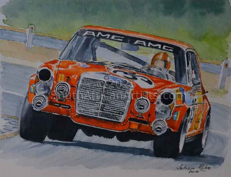 Johan has become a Member of the Guild of Motoring Artists (UK) in 2014 but has since resigned to concentrate on the South African market.He write regular articles about his paintings of motoring/motorsport subjects for the SA Car Clubs magazine. Since 2016 he has again started to work in watercolours as well. His work was accepted by a local Art Gallery, Bottega, where he has a permanent stand with his non-motoring paintings.
