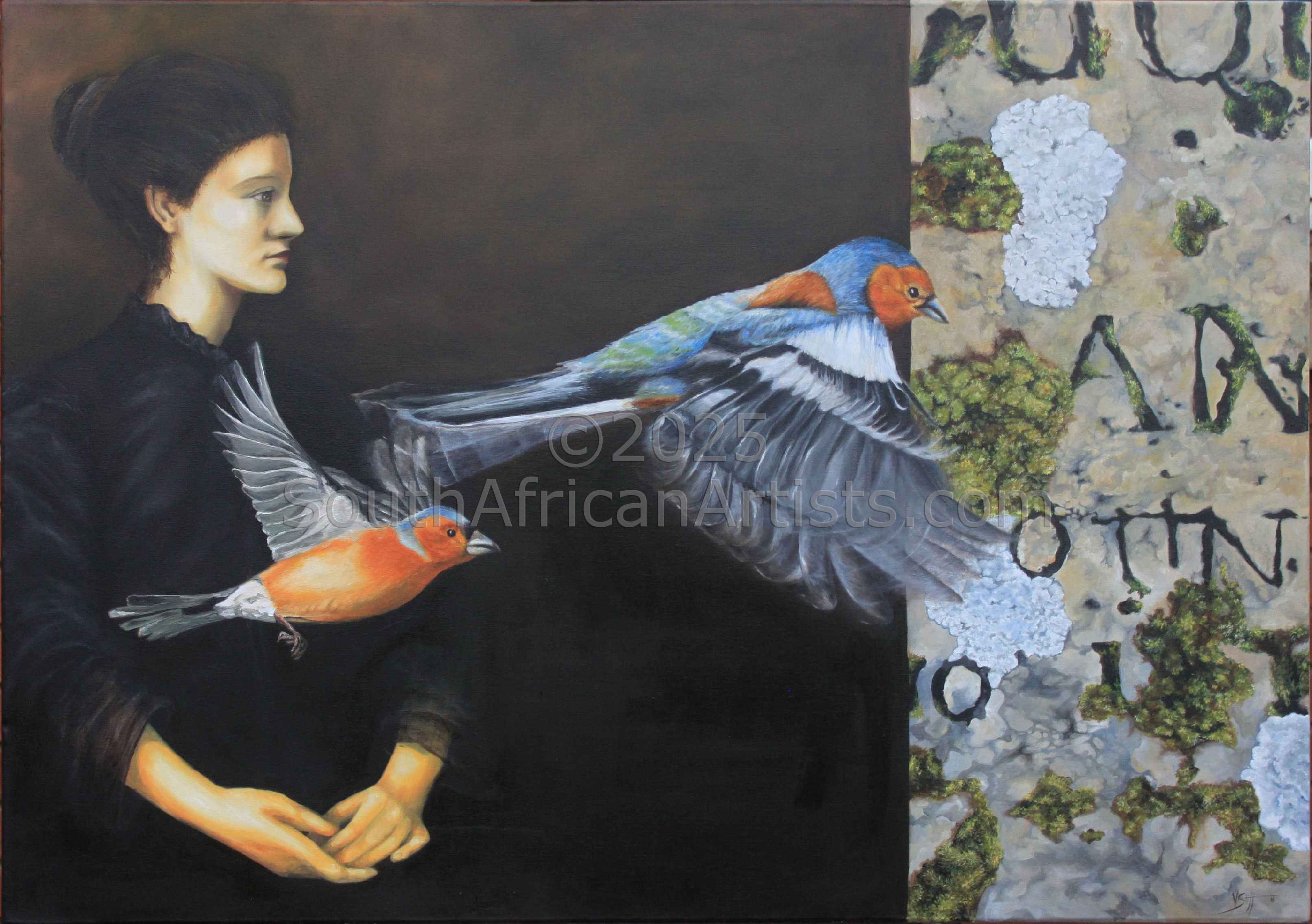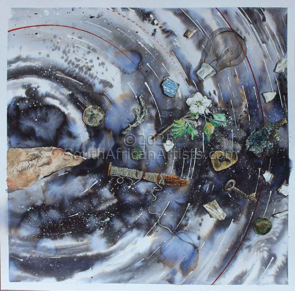 Having painted under the name of Vicky Riley for the past 7 years she has elected to revert to her maiden name of Stiff. Victoria is inspired by the world around her, and does diverse works depending on what has made her heart sing or cry at that moment. Emotion and contemplation of life, is often the catalyst for her work. She observes, thinks, and converts her opinion and observations into artworks. Art for her is the expression of the soul, which comes in many forms. All her work is done with precision. She is tireless in her quest for perfection. She is currently working mixed media, oil on various paper supports, maps, books, patterns. Found objects, that are a commentary on life, as we as humans have molded it. Her work endeavors to instill in the viewer a desire to engage with, question and understand the work. The use of everyday objects is intentional to allow the viewer to relate to the work. Vicky also finds expression in sculpture, which creeps into her portfolio in various forms. Most prominently at the moment as Ceramic frames, custom made for the work they house. She is constantly influenced by contemporary South African artists. The work of Caryn Scrymgeour has had a great influence on her, and was the springboard for her current portfolio of work.