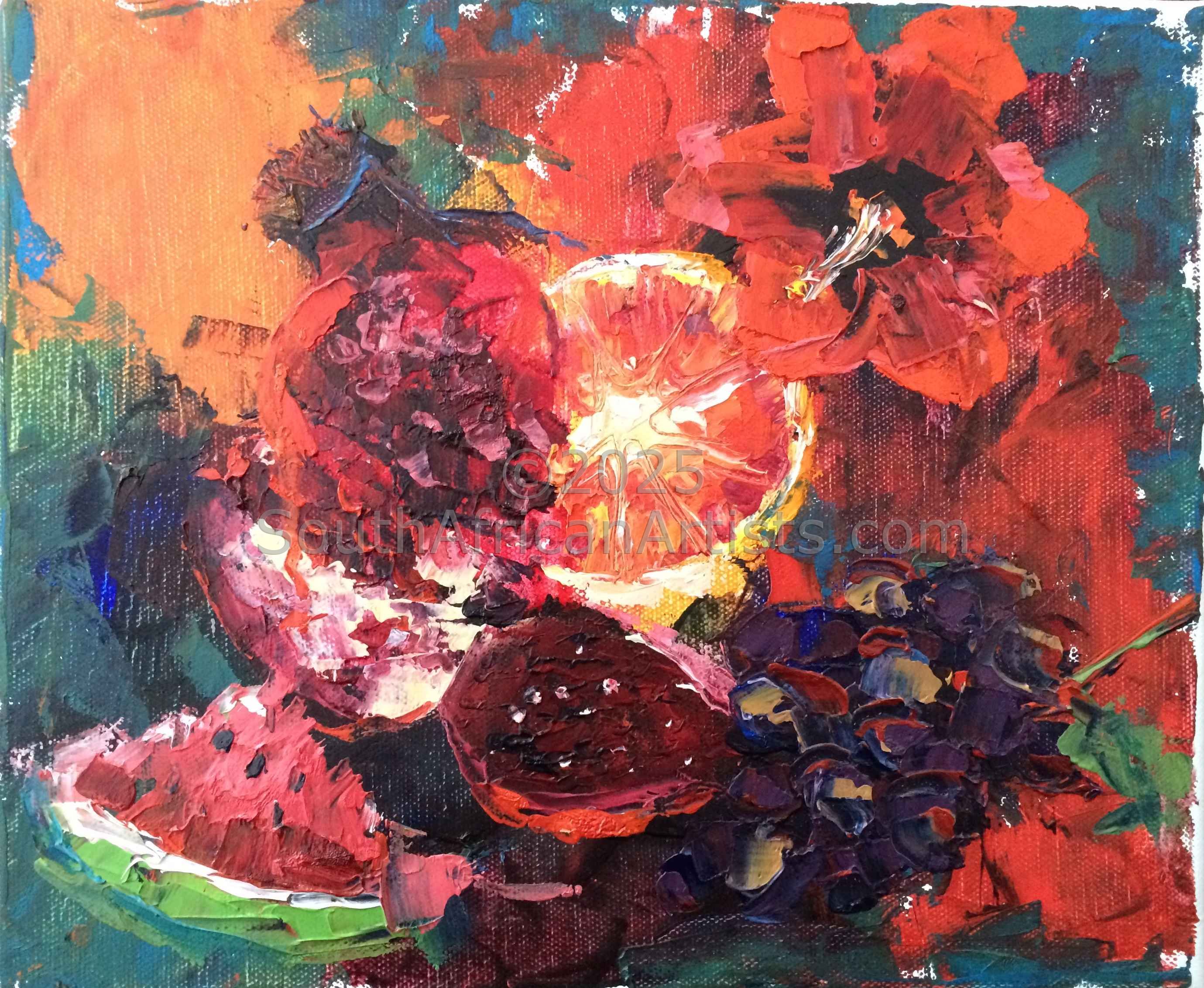Studied HED Domestic Science at Potchefstroom University during which time she was introduced to the arts. Started painting in 1995 took art lessons over a period of 4 years from various artists in Mpumalanga namely : Melite Grobler, Belinda Wessels, Carel Maree and Boe v Zyl. Prefers working in oil as a medium.Views work as realistic, romantic and at times impressionistic and has a passion for romantic scenes with figures, flowers and fruit