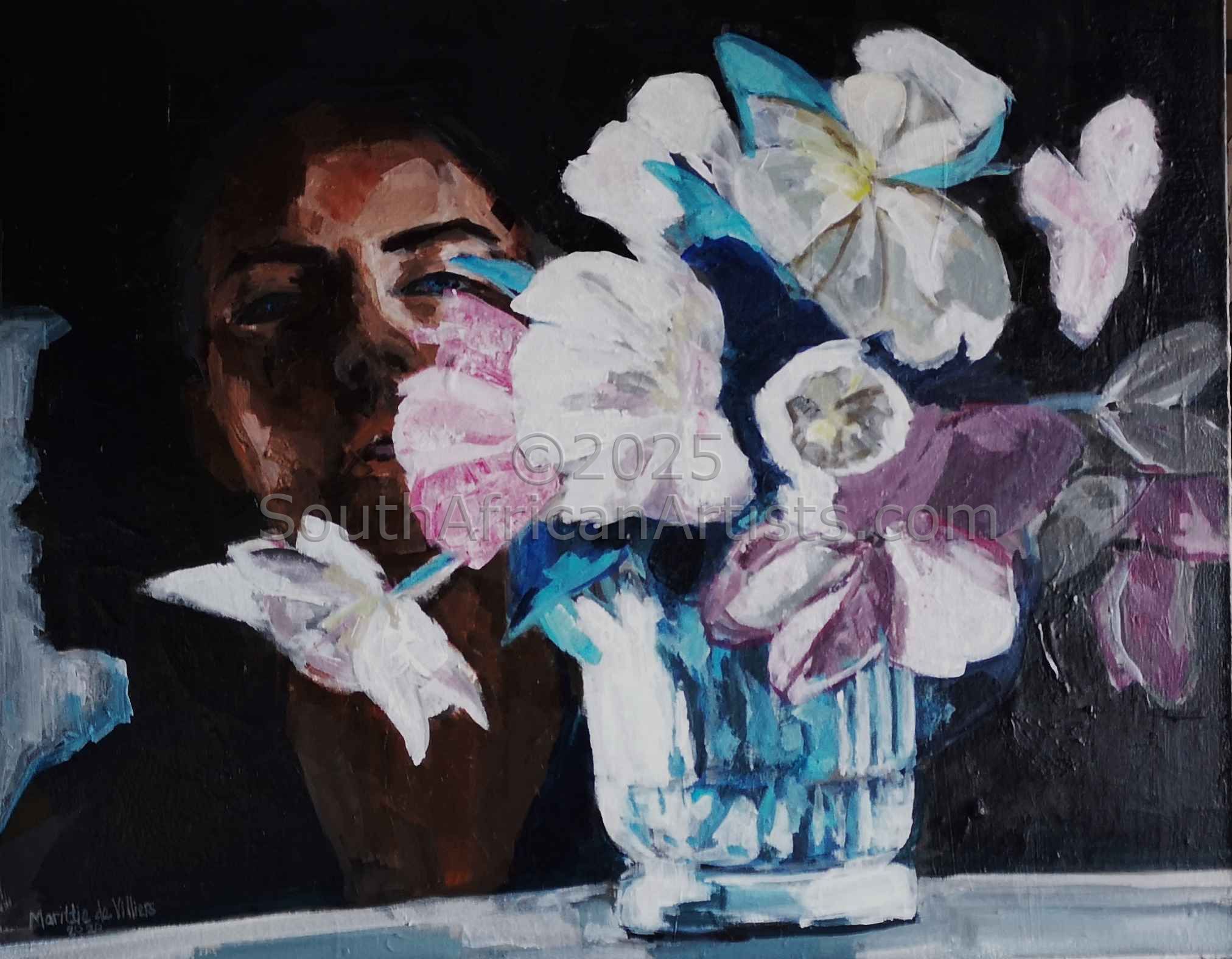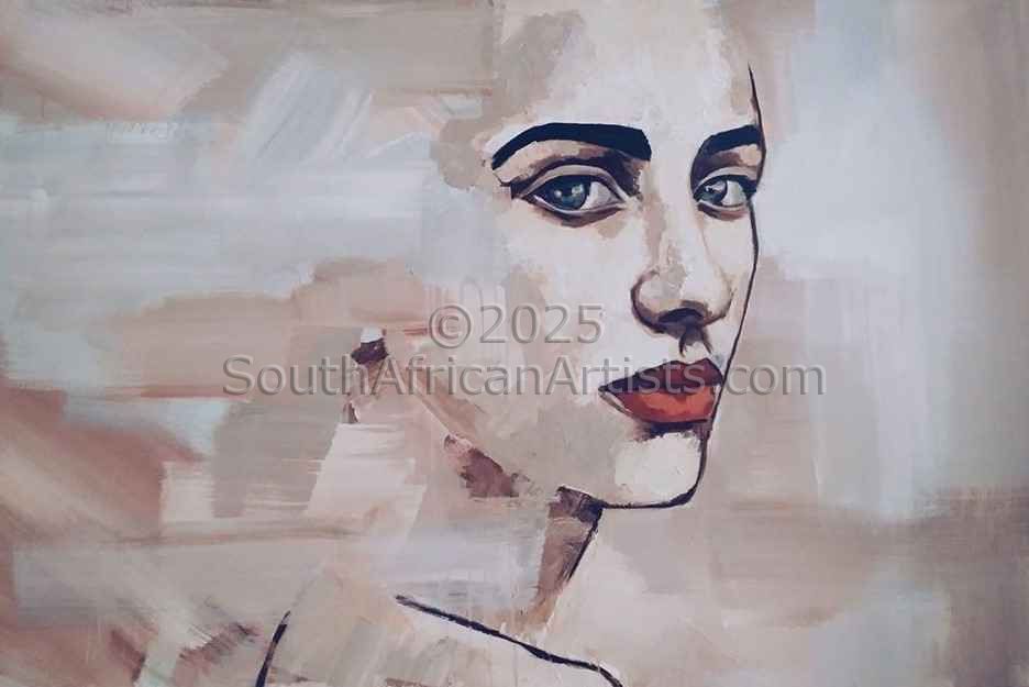 I grew up and matriculated in Potchefstroom and earned my degree B.A. (Communication) from Potchefstroom University. Travelled between 1994-2003. By land- Egypt, USA, southwest, and Midwestern states-special interest Art and Native American Reservations. By sea on a yacht- South America, Caribbean Chain up to Bahamas and again USA on the East side. Live south of Washington for a year or so and sailed south again- to the Caribbean. Faces fascinate me endlessly. Creating emotions and atmosphere through the use of colour in the human face and figure are the most important elements in my paintings. I make flat-surface "MOVIES" when I paint. I become the figure, the emotions and landscape of thoughts. My memory serves me well in remembering people and the atmosphere while experiencing situations. I easily recall the smell of the turqoise Caribbean Sea, the atmosphere of a busy street in Cairo, the easy-going but mysterious sounds of a foreign language. The excitement of hearing a mix of Dutch-Portuguese-English, Cerveja on my lips, the feverish humidity of walking in Fortaleza, Brazil. The human being in all it's aspects interests me. I am attracted to the exotic, the gypsum, and passionate side of life. Light and dark is often used to create tension and a strong feeling. I enjoy painting the old and young, pretty and less pretty...I live and work in Cape Town.