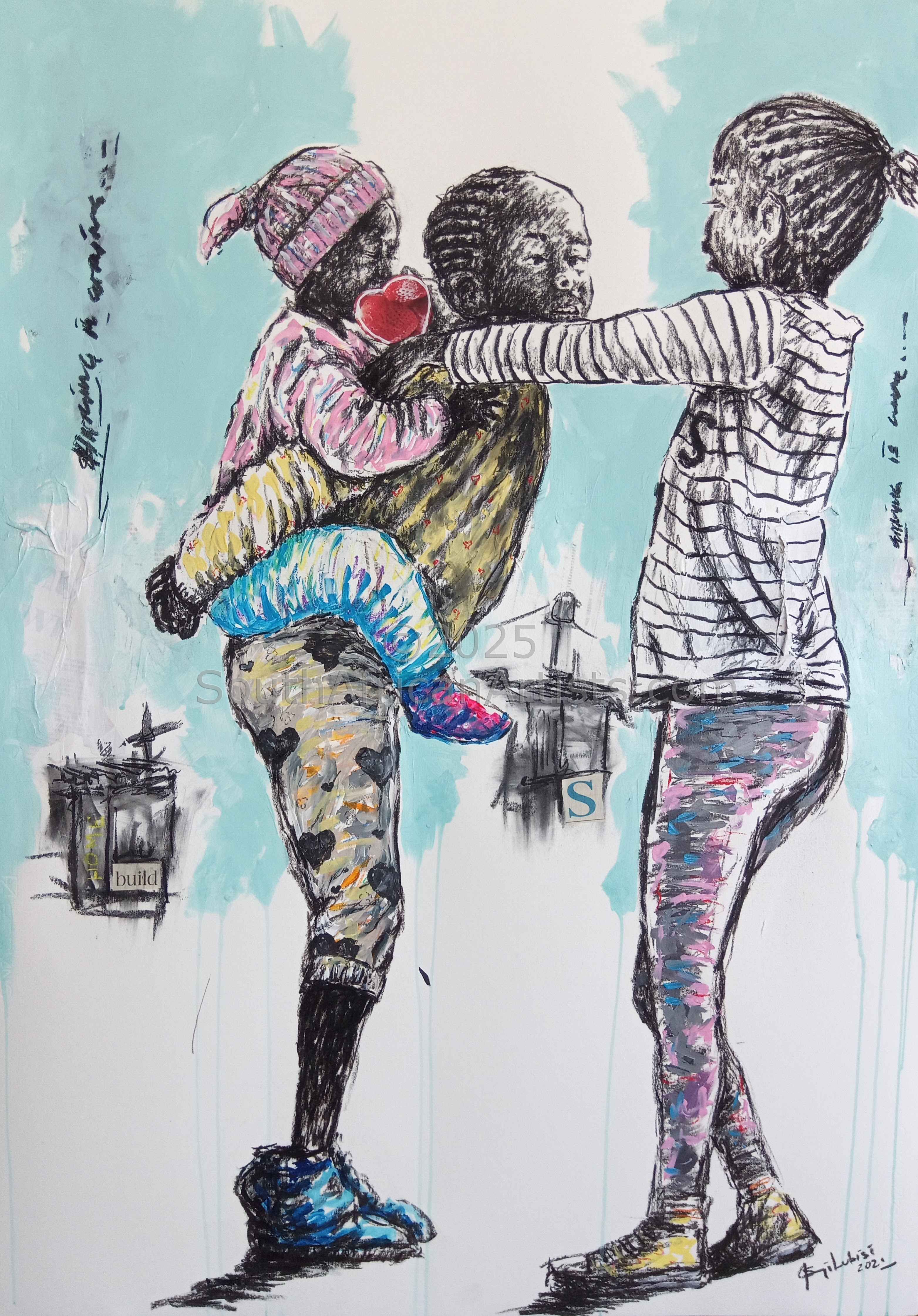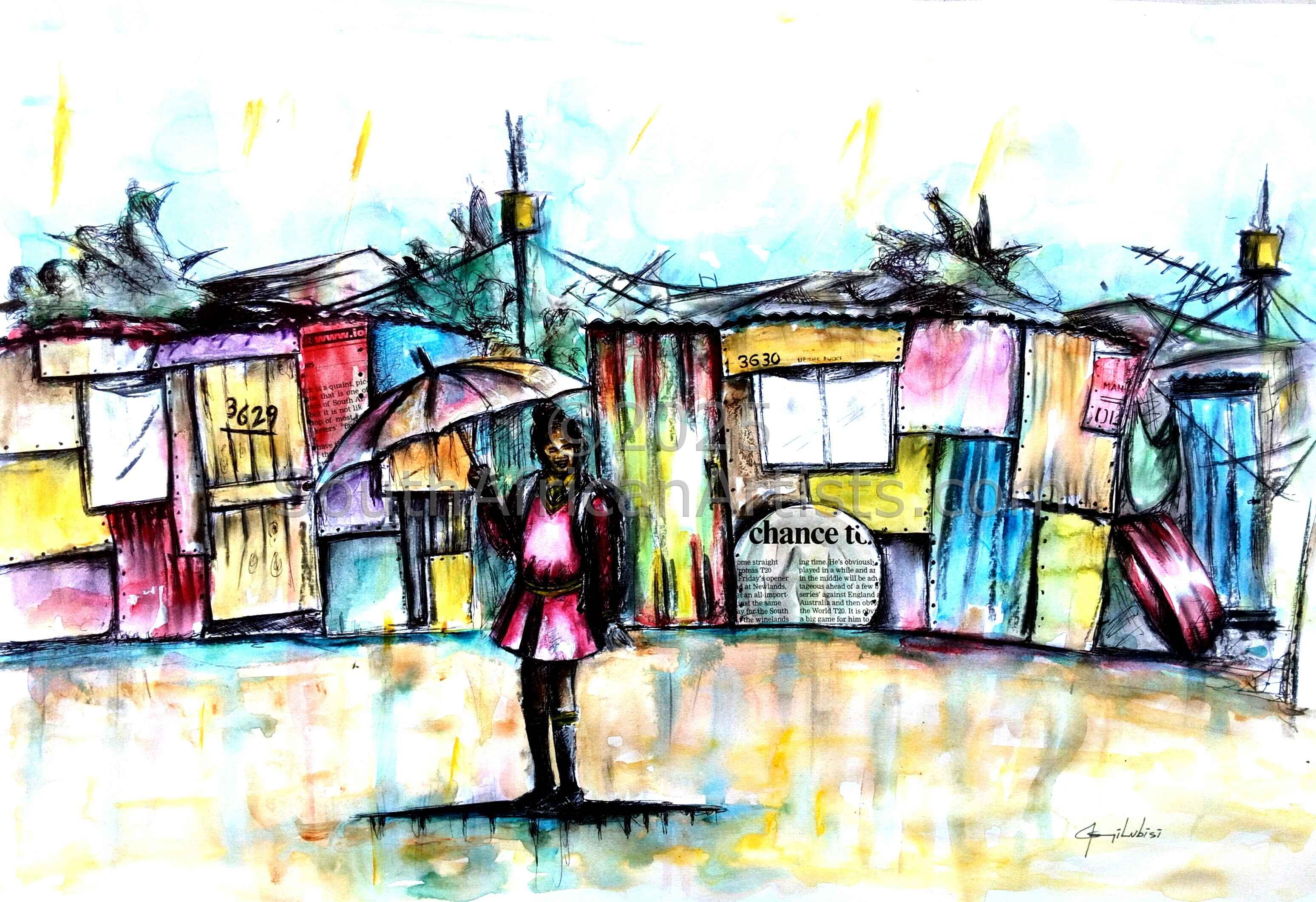 His works are characterized by the dominance of township ambience, which reflects the connection the artist has for his neighbourhood. He draws inspiration from the day to day lives of ordinary people in the township and makes use of charcoal, watercolours & acrylics on paper to relate stories & experiences of the township lives.