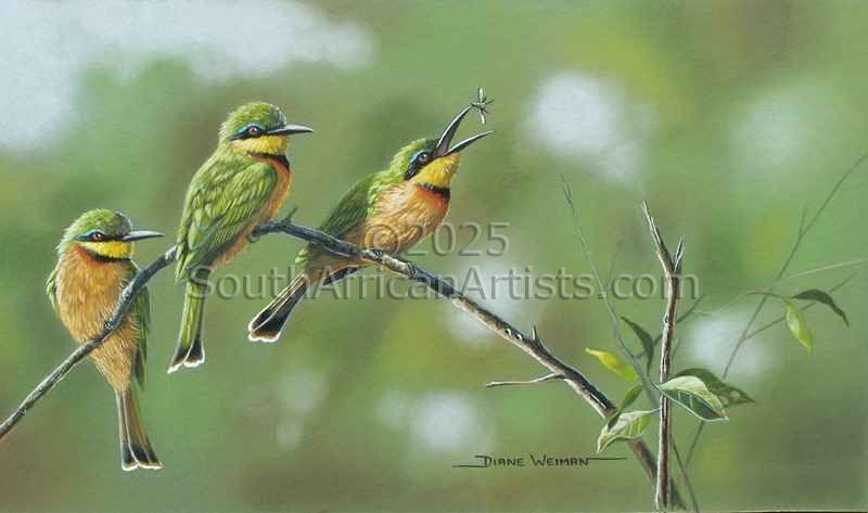 An accomplished pastel, wildlife artist, her paintings are well known for their lifelike realism and sensitivity. She is widely acknowledged to be one of the best bird artists in South Africa. Diane's work is inspired by her love of the African bush. Diane's paintings are not simply portraits of animals and birds but bring a sense of special moments in nature to the viewer as she depicts the subject in its natural environment. Her art is represented in corporate offices, game lodges and private homes. Diane's original paintings and limited edition prints are to be found in the U.S.A, the U.K, New Zealand, Australia, Canada, Denmark, Switzerland, France, the Netherlands, Israel, Saudi Arabia and Spain. Diane is a committed supporter of wildlife conservation. Price Range US$ 842-1,579 Exhibitions She has held numerous group and solo exhibitions in Limpopo, Gauteng and KwaZulu Natal. People who chose Diane's work also chose work by: Find other: