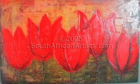 My inspiration came from my mom, Ester Jonck that was an artwork herself! Since I can remember everything she looked at was described as an artwork....and that is how I grew up....looking through the eyes of an artist... seeing everything I look at as a possible artwork....and putting it into perspective of the world we live in.... The beauty of nature and the colour of Gods glorious creation inspire me from day to day....Growing up in the desert of Namakwaland (Aggeneys..between Springbok and Pofadder) and moving to George made me aware of how natures beauty can differ...and how awesome each part of ort country is. When I got married, I lived in the Kalahari desert next to the Botswana boarder near Askham for 11 years. Breathtaking sense of sunsets over the dunes and late afternoon thunderstorms will always inspire me to use vibrant colours in my art. Texture is also an amazing medium to work with. The balance and contrast between texture and colour is the main focus of my art. I like working with painting knives and brushes as it allows me to put the paint on thick and get down some good texture. I also like working with various underpainting colours and textures as it can allow some very interesting effects to come through to the upper layers of paint. Oils are particularly good when working with transparent colours.I am an interior design consultant and therefore love creating an artwork to compliment the area it is created for. The composition of the artwork will be an enhancement to create a unity between art, interior and architecture. I work in any medium and cannot classify my art... It all depends on my mood.... Price Range US$ 104-1,565 People who chose Lize's work also chose work by: Find other: