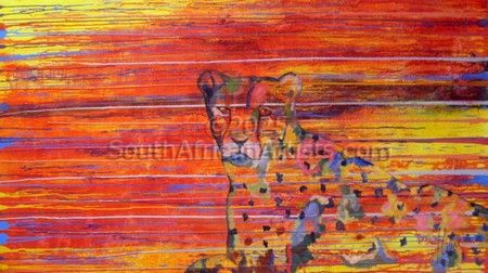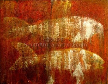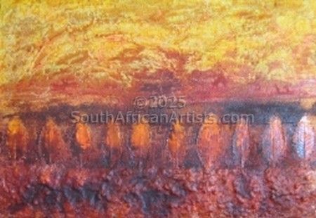 During her training as a clothing designer she ecquired knowledge of figure drawing, colour and textures. This ability proved to be of great ddvantage when she became aware of the intriguing expressions f the 'Xam people' (Bushman) in their Rock Art, while visiting sites known for this art form. Spiritual symbols in geometric forms which they used to communicate through in trance dancing, fascinated her and inspired her to use these symbols to create paintings with a strong modern feel but with a very ancient spiritual connotation. Her love for nature, people and experiences made her very creative and original.