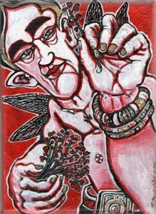 The character was seen in the paint marks on my canvas, outlined and enhanced with gold leaf.