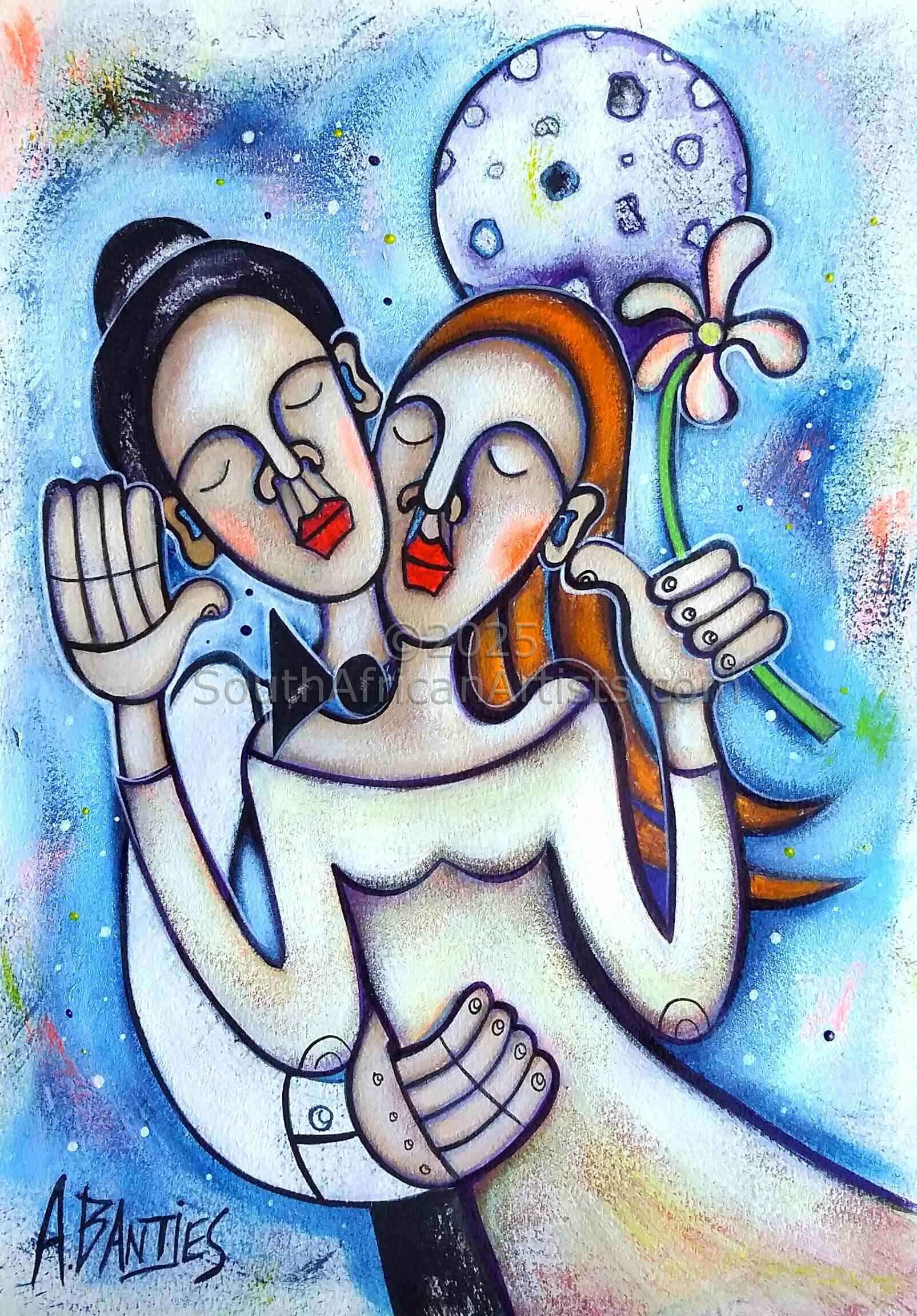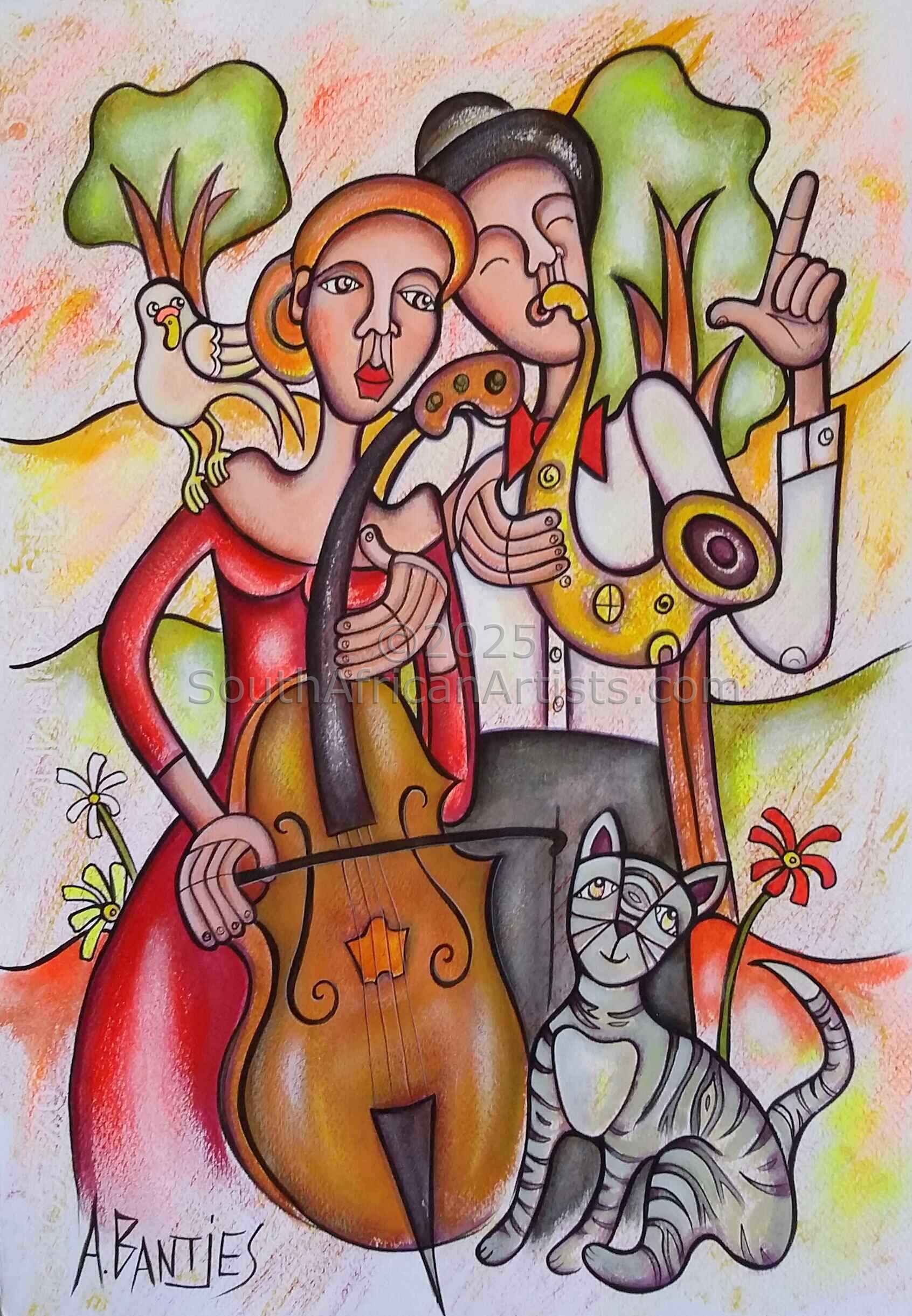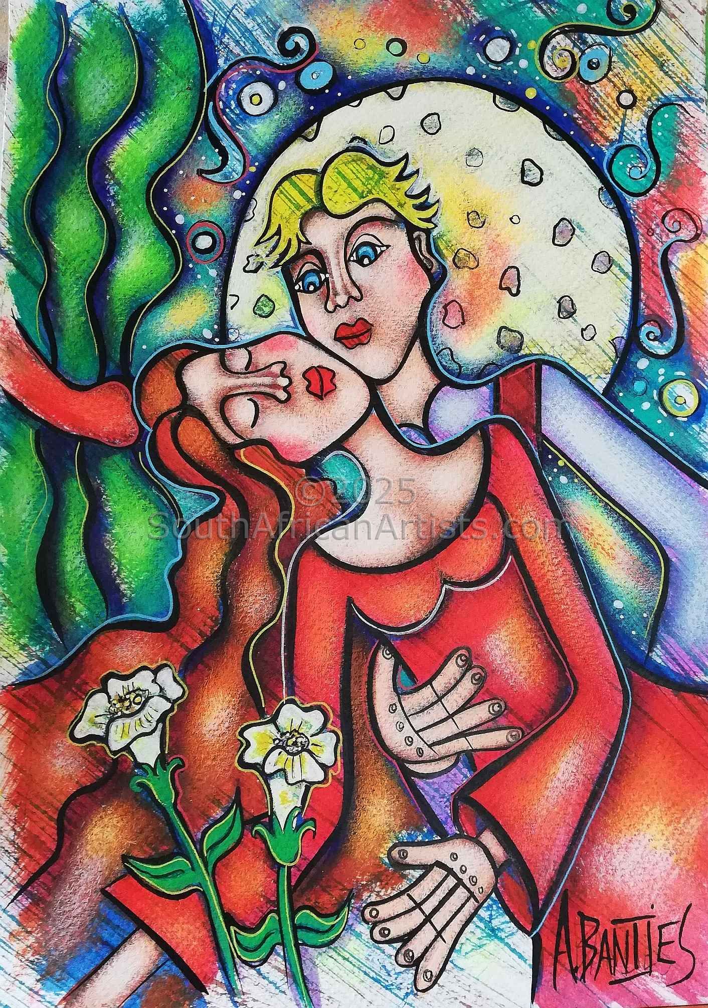 Adele Bantjes was born in 1976, Roodepoort, Gauteng, South Africa and began painting after completing High school in the picturesque little town Zastron in the South Eastern Free State. She is a full time artist and has dedicated herself entirely to Naive Art. She works on both canvas and paper in mixed media. Some of her art is done in Bas-Relief.