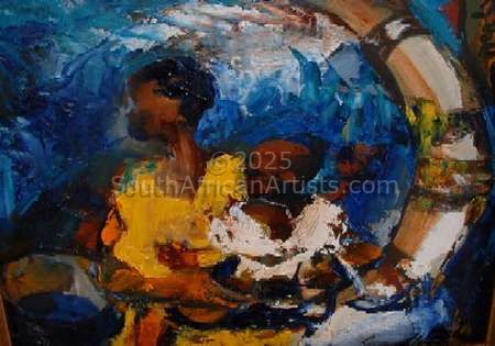 Living in Africa is like being seeped in the sun baked colours of burnt sienna's, bright yellows and strong blues, everything is vibrant, dynamic and has the wild strength and heat of the Continent reflecting through it. This artist seeks to capture the essence of this on canvas.
