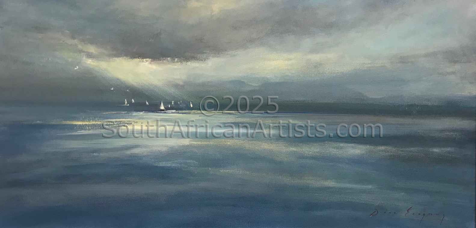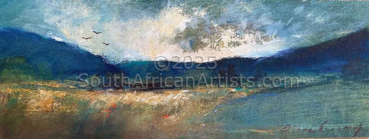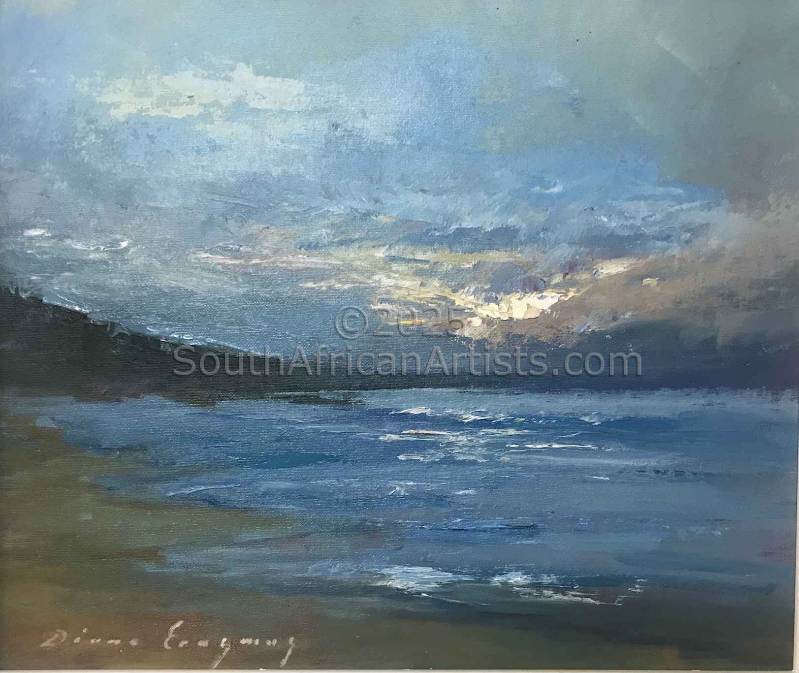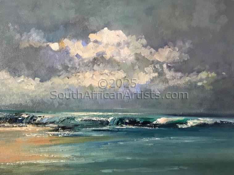She is based in Ramsgate on the South Coast of KwaZulu Natal and draws inspiration from the naturally beautiful landscapes and seascapes of the area, as well as from her intense interest in both nature and human nature. Diane's work appears in galleries around the country. The beauty and grace of line and form, the essence and radiance of colour and the fall of light, compositional balance and that intangible spiritual quality that connects the artist to the viewer, these are the elements that define great visual art. It is these elements that are most eloquently expressed in the work of Natal Artist Diane Erasmus.