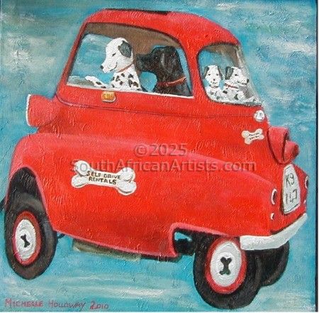 In the joyous spirit of the naive genre, Michelle records daily life in acrylics on canvas, often with a nostalgic twist. She creates paintings of classic cars, favourite people and animals,and city and country vistas that make you smile. Her work may be found in private collections throughout South Africa and also in the United Kingdom, Holland, Germany, Sweden and the United States and Canada.