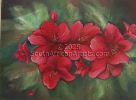 About Merle No matter what your age - God has given us all the gift of creativity. He gave it to the bushman, who left masterpieces in caves, they were inspired by what they saw. All of us can create our own masterpieces in whatever form. My art is from my heart - what catches my attention,inspiration,feeling,all play a part in what medium and subject I will paint. I love our country's wide open spaces.The serenity of the Karroo and Free state, The energetic thundering of our seas. The perfection of flowers.I have had no formal training but have attended workshops to polish my work. My teachers were such amazing people that they have shaped my work into what it is today. I have been given the opportunity to help people to get in touch with their "right brain" and show them that art relaxes and de-stresses one. Price Range US$ 72-316 Exhibitions Annual Exhibition: Floradale People who chose Merle's work also chose work by: Find other: