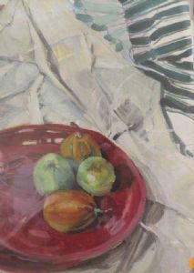Reference Home Gallery About "Still Life - Red Bowl and Fruit" This ceramic red bowl on the pale cloth invited me to play around with some fruit to see what complemented them best. I chose a couple of green Granny Smith apples and small overripe gemsquash ! |